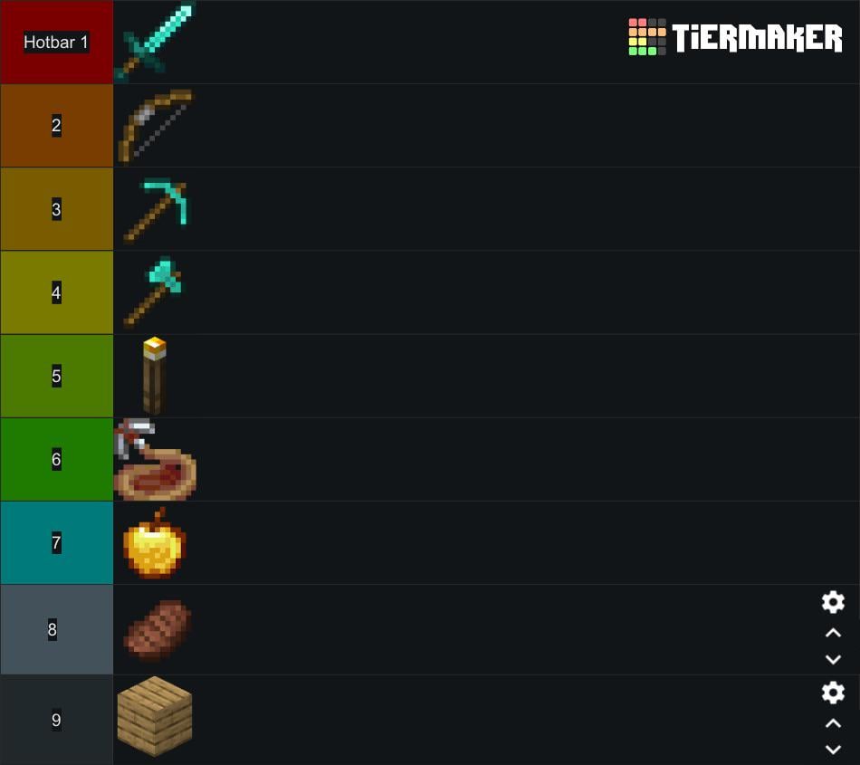 Pick, axe, sword, shovel, pillaring block (cobble, dirt, etc), free slot, food, water bucket, torches. It’s been this was since infdev and it’s muscle memory at this point so it’ll never change.
