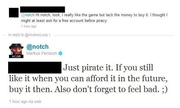 In the image is a 2012 conversation between Notch / Markus Alexej Persson (Former CEO of Mojang / Creator of Minecraft) and a fan on Twitter (X), talking about how they did not have enough money to buy Minecraft and thought they might at least ask Notch for a free account before considering any unofficial alternatives.