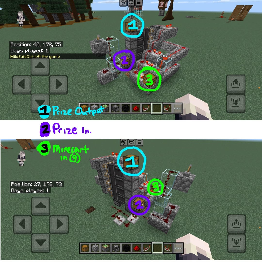Goal: a game that when 9 minecarts are in the [green 3] chest then a prize from [purple 2] chest is output into [blue 1] chest