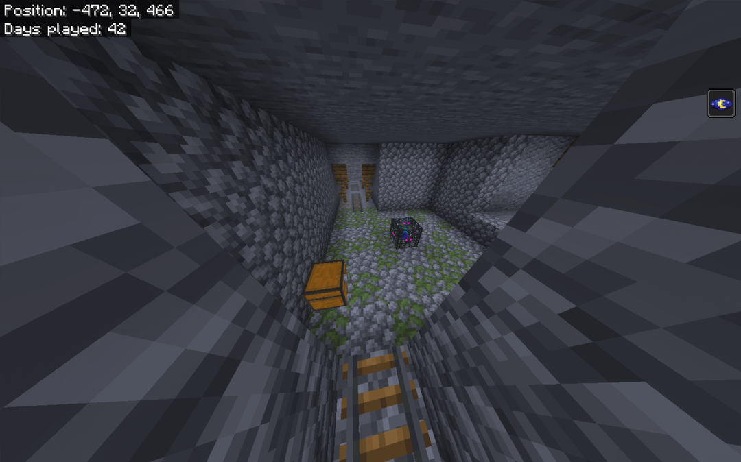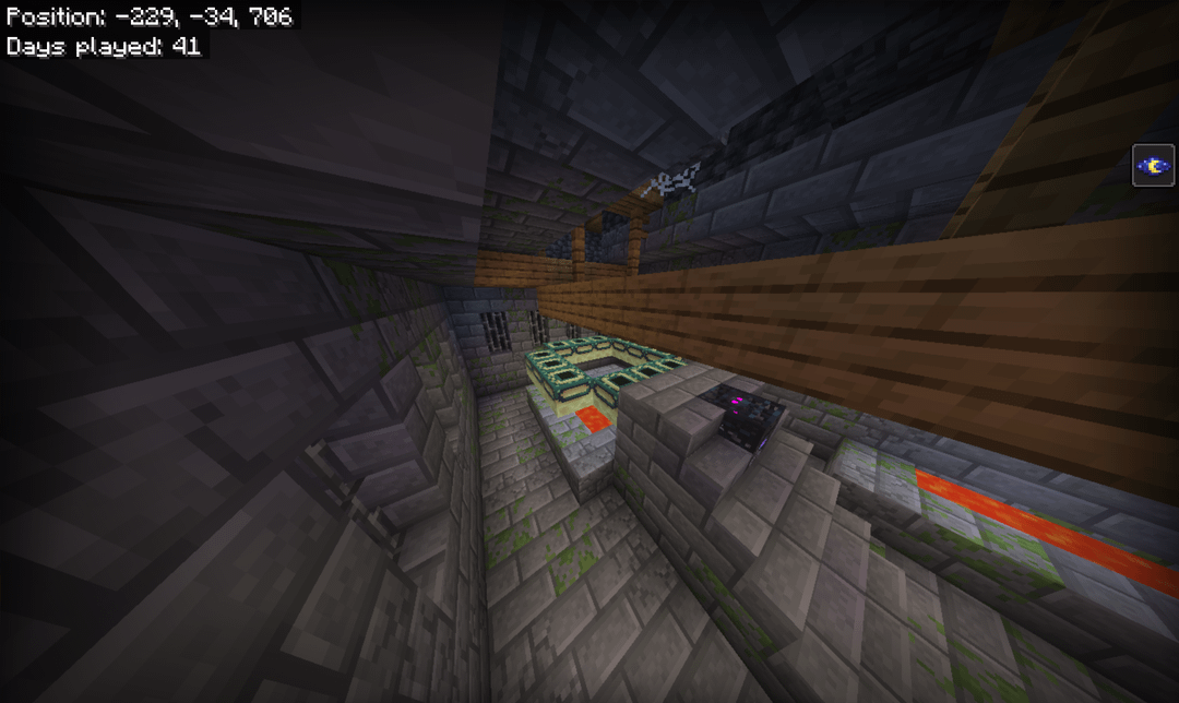 The end portal sits below a catwalk of the mineshaft. This is one of the most expansive mineshafts I've ever seen. Each screenshot includes nearby coordinates.