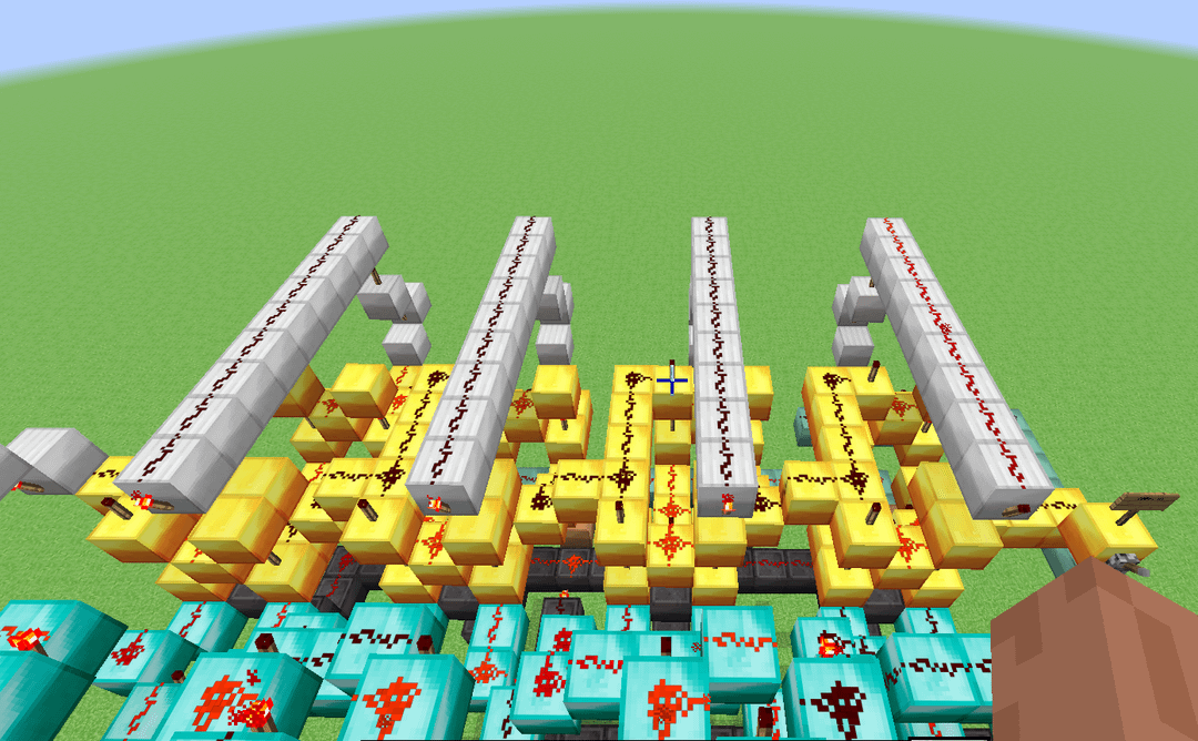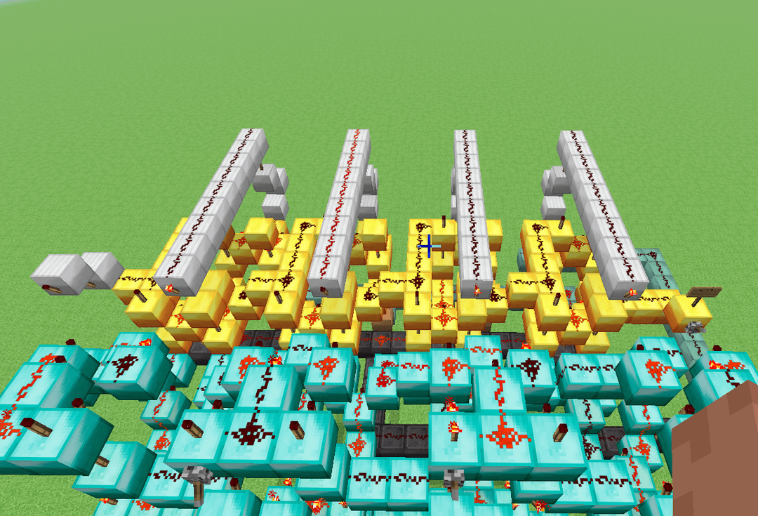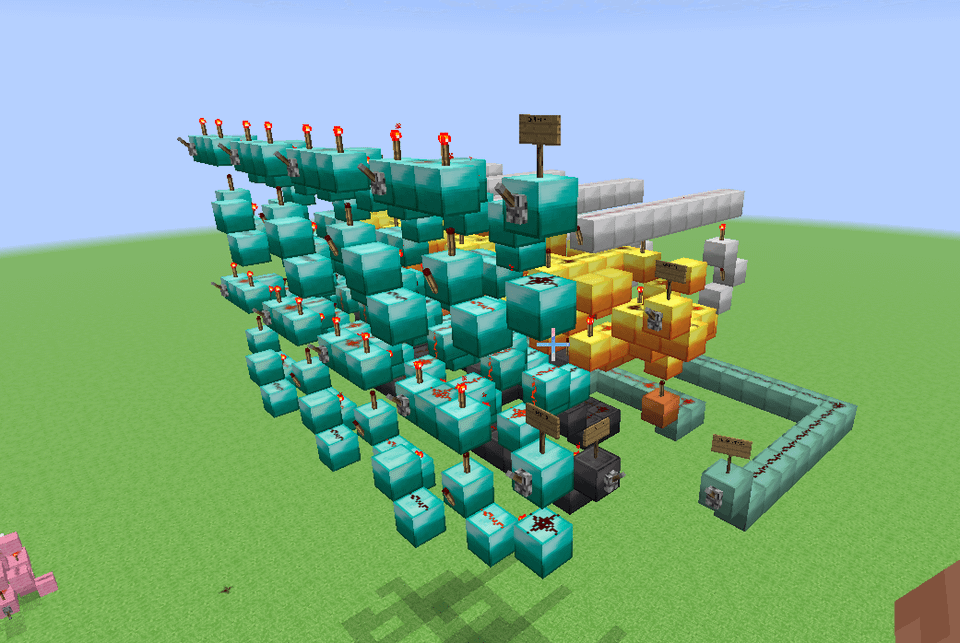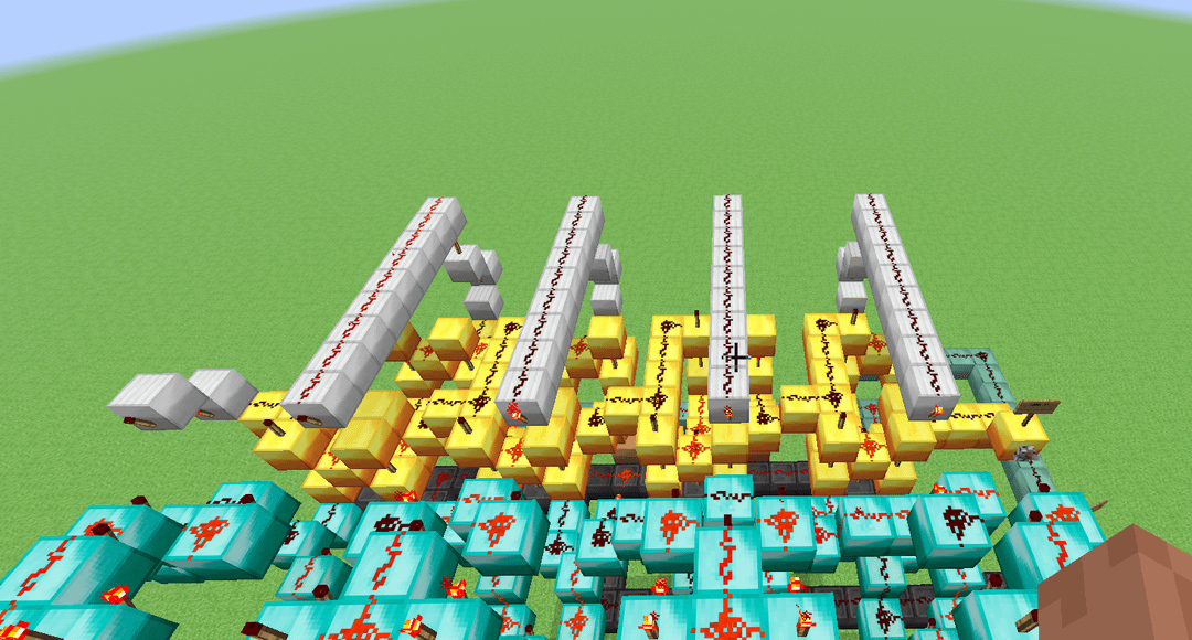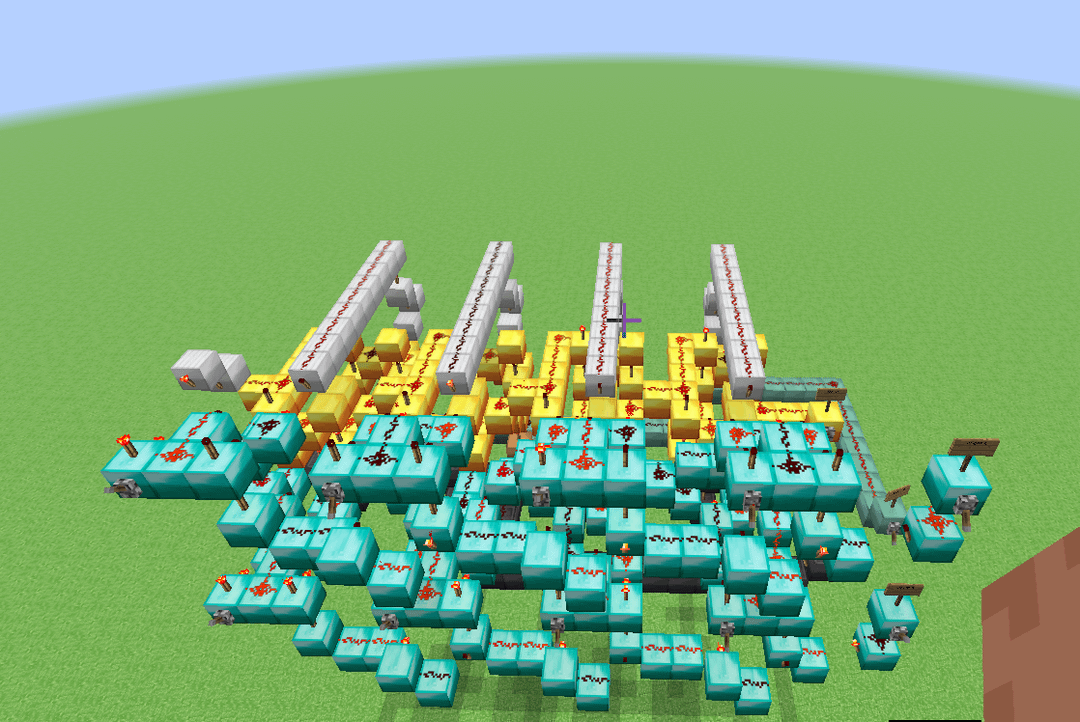 This here is a design for a 4-bit ALU that (theoretically) could be built in a normal alpha minecraft world, meaning that I limited myself to only building with dust, torches, levers and solid blocks. It's slower than molasses, but it has 11 functions (Add, Subtract, XOR, XNOR, OR, NOR, AND, NAND, Implies, Nimplies, Left shift) Credit to mattbatwings's excellent series "Let's Make a Redstone Computer!" for the original design, which I then modified to remove every component that did not comply with my restrictions (mostly subbing out comparators for bulkier block-built logic gates)