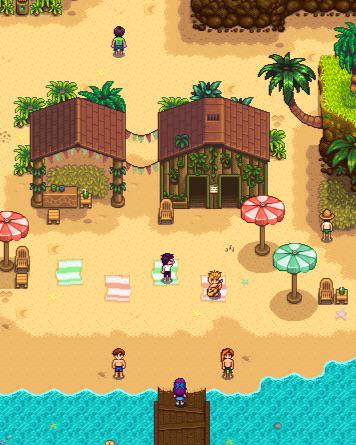 What did I walk into?? Sam with an acoustic guitar and Harvey wearing a speedo and a sun hat ..I can’t by curiousspaceycadet Stardew Valley