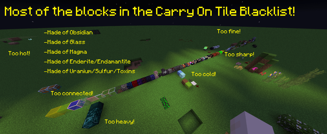 - Carry On block carrying feature is enabled by default with a massive blacklist to enforce balance and realism; some blocks are too heavy, some are too sharp, some are too fine, some are too hot, some are too cold, etc. for the player to carry in their hands