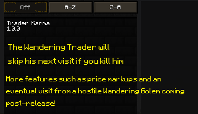 - Custom Mod (TraderKarma): The Wandering Trader now drops goodies on death. To make killing him more of a risk/reward proposition, the Wandering Trader will skip his next visit to you should you slay him. In future updates there will be a Naughtiness System of sorts in which the player receives harsher and harsher penalties for additional Wandering Trader kills.