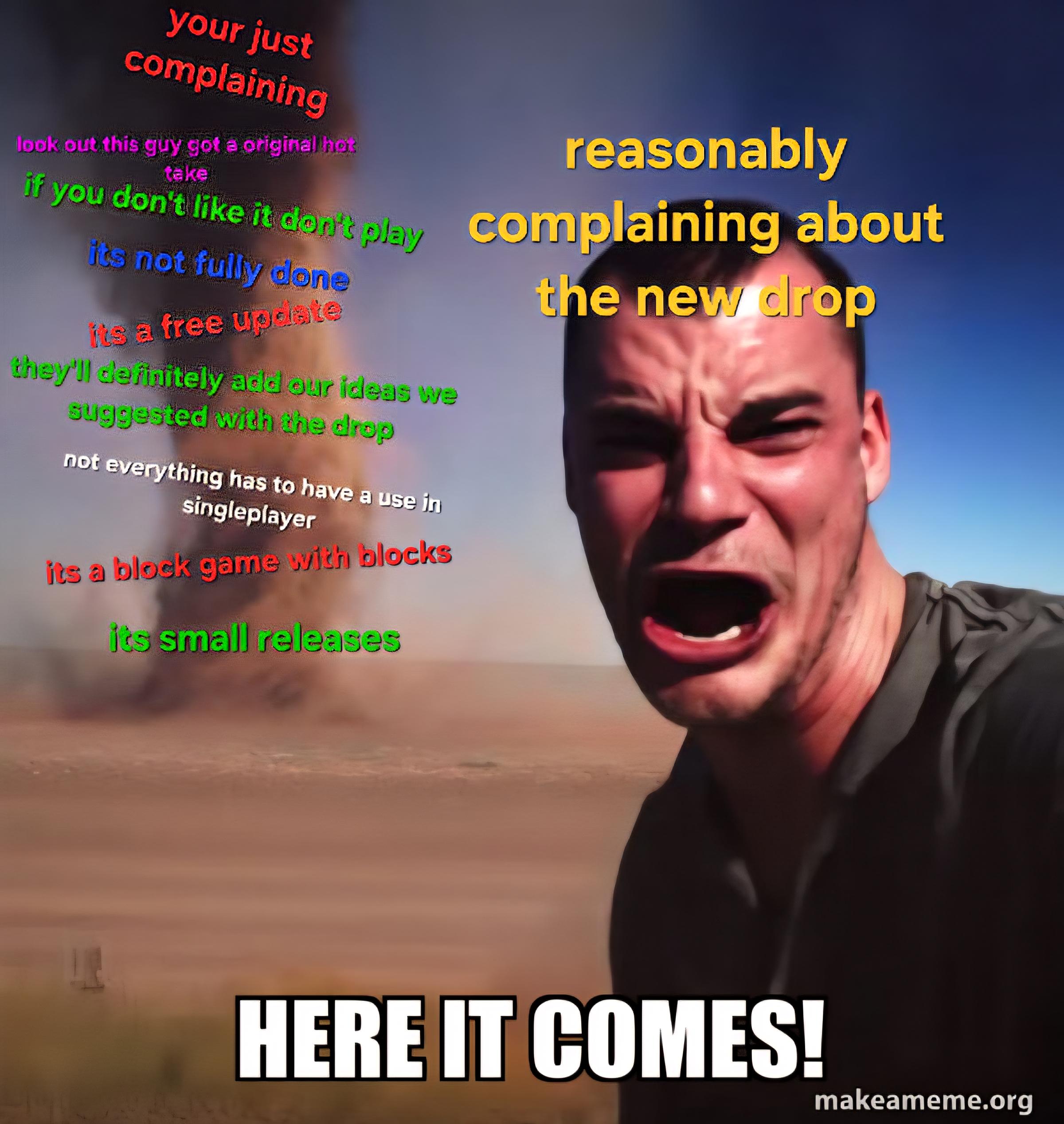 Alright, we get it. You don’t like the new update. You’re in good company- a great many people here don’t. I, however, do- quite frankly, I’m astonished they’re giving us anything. Also, who the hell said that “not everything has to have a use in singleplayer”? That’s one of like, three things in that tornado I disagree with.