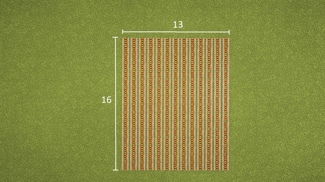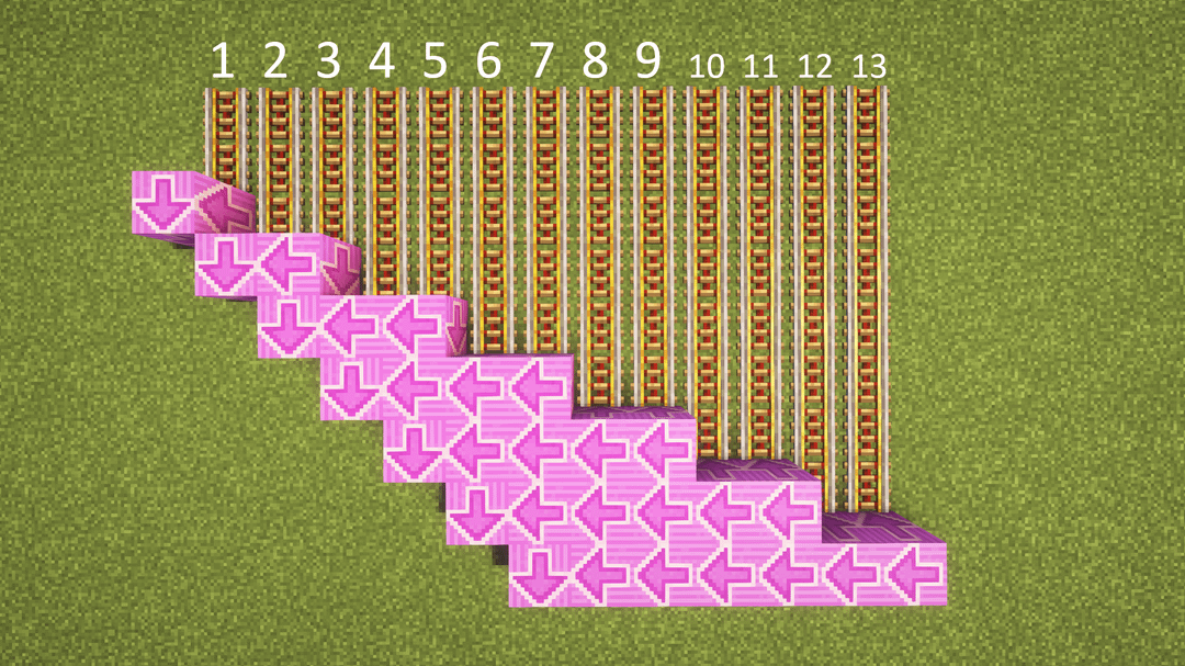 I have 13 lines of powered rails, each 16 blocks long. If I number the rails from left to right, I need to activate them in this order: 1, 3 2, 5 4 3, 7 6 5 4, 9 8 7 6 5, 11 10 9 8 7 6, 13 12 11 10 9 8 7 (see the second photo).