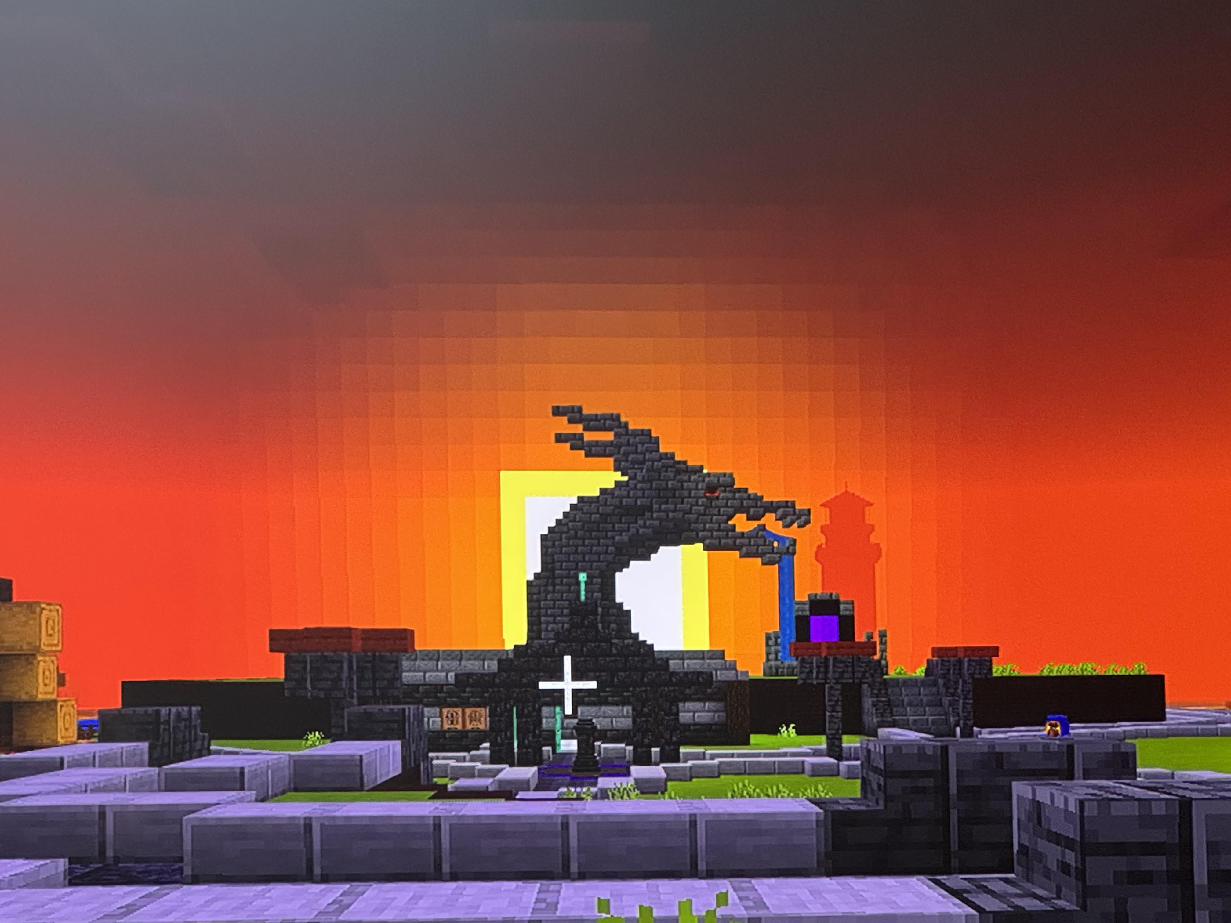 Was working on my elytra tower and noticed my dragon statue lines up really well with the setting sun. by deadbeforedawn96 Minecraft Minecraft Builds