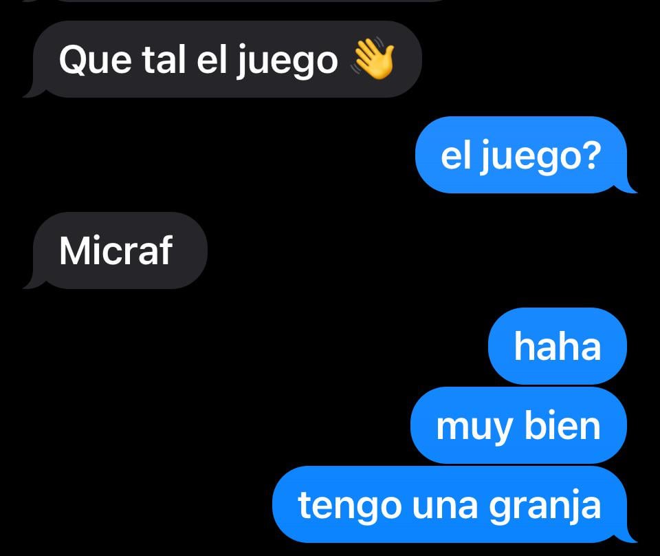 Mom- Hows the game? Me- the game? (Thinking she meant to text my brother who is hanging with his friend playing soccer) Mom- Minecraft Me- haha, very good, I have a farm ORIGINAL IS IN SPANISH : P she is the best 😚 by whois-eli Minecraft