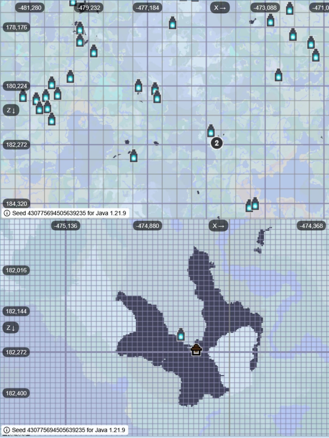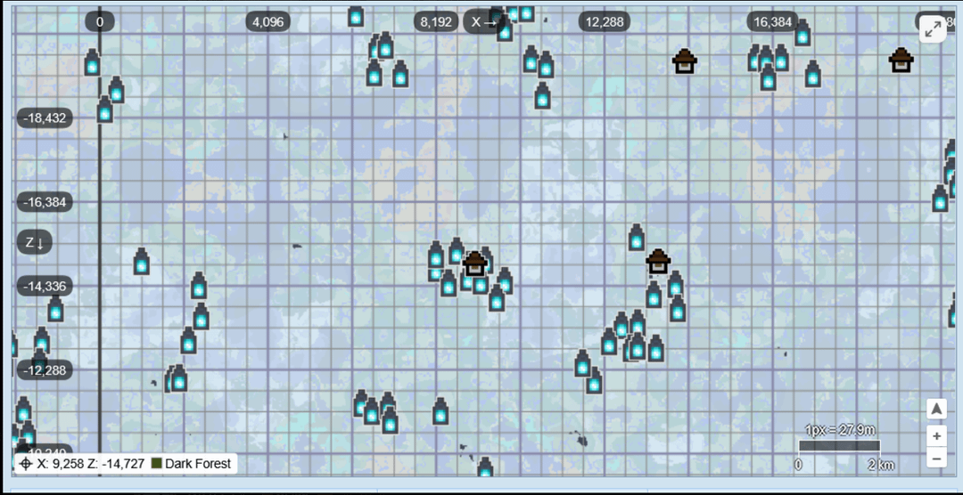 Slide 2: A 7-Ancient City cluster with a mansion inside it at around X: 9k, Z: -14k.