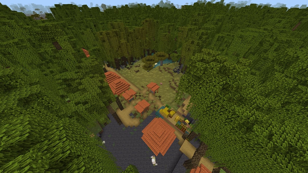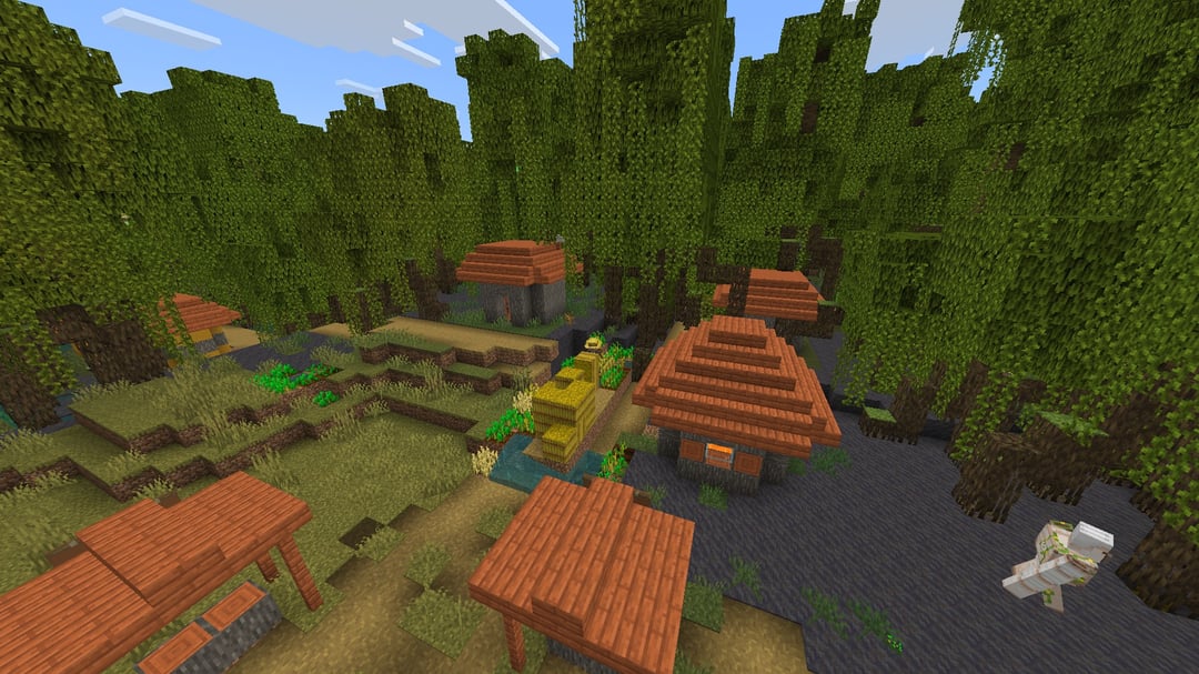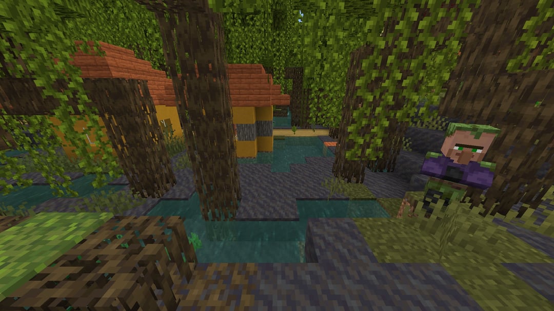 Seed 8054079565619993776. A village almost completely lost in mangrove swamps close to spawn (X -312 Z -344). Generates many natural swamp villagers (which I love). The village center is on a tiny patch of savanna biome inside the swamp. Found in current Bedrock edition (26.10).
