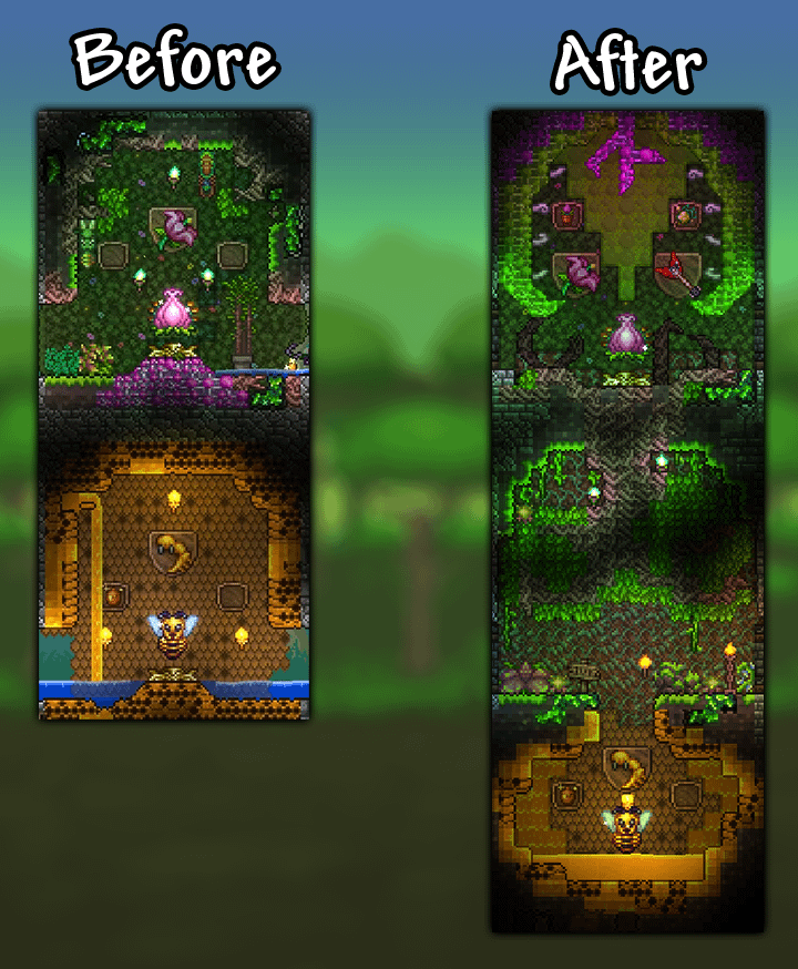 I also wanted to realize the idea of a living and growing jungle, so the plantera's trophy room was combined with another jungle predator – the queen bee. Tell me what you think!