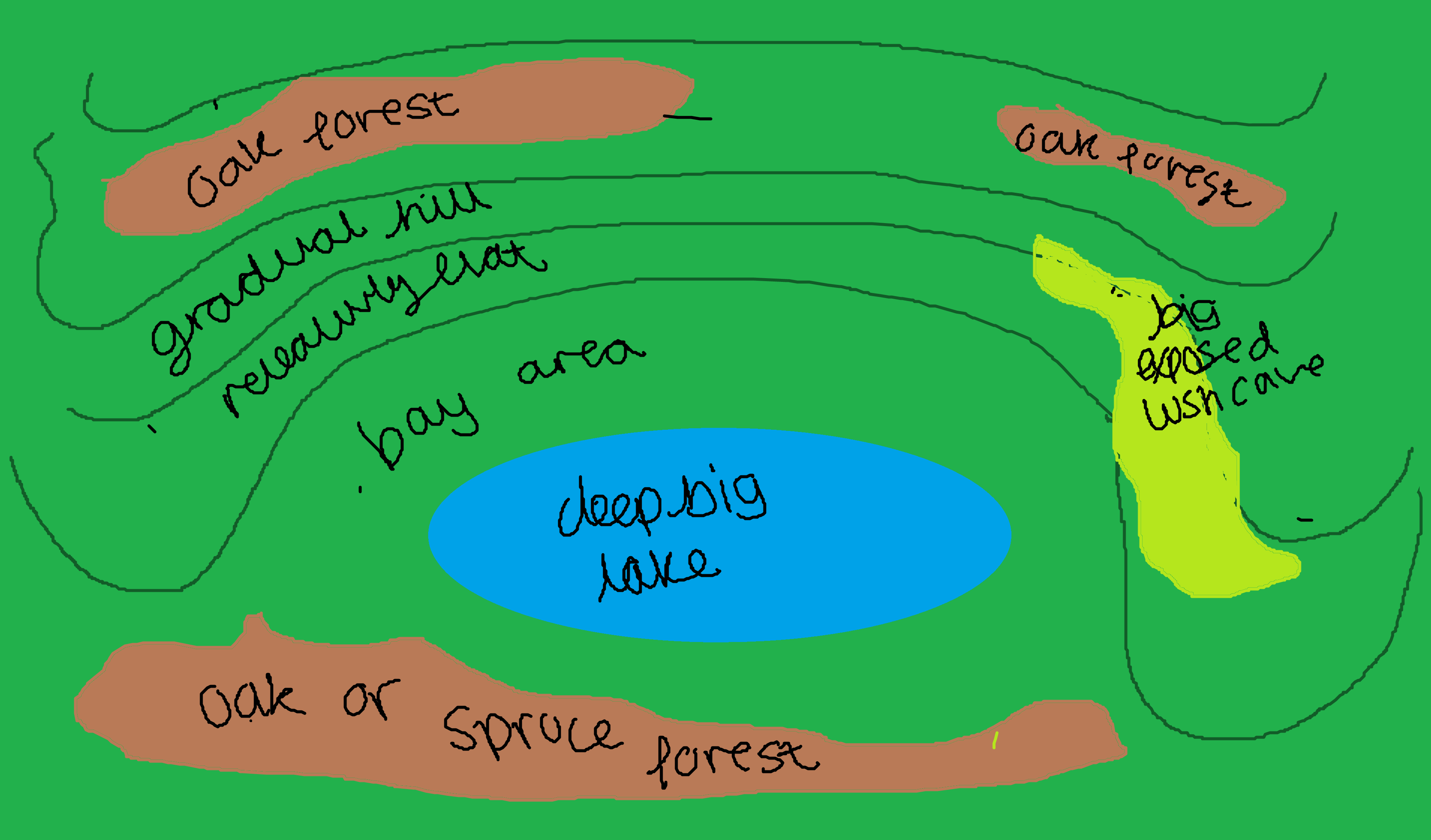 howdy!, I'm looking for a seed similar to this. I dont really mind if its not at spawn but relatively close to spawn. Sorry for the basic drawing of it but I hope it easy to see what I mean. I'm looking for a gradual hill/mountain (with no snow or stone if possible) with flatter areas i want a big deeper lake with a decent sized bay area and a spruce or oak forest and finally the exposed lush cave that has a wide opening but doesn't ruin the hill!