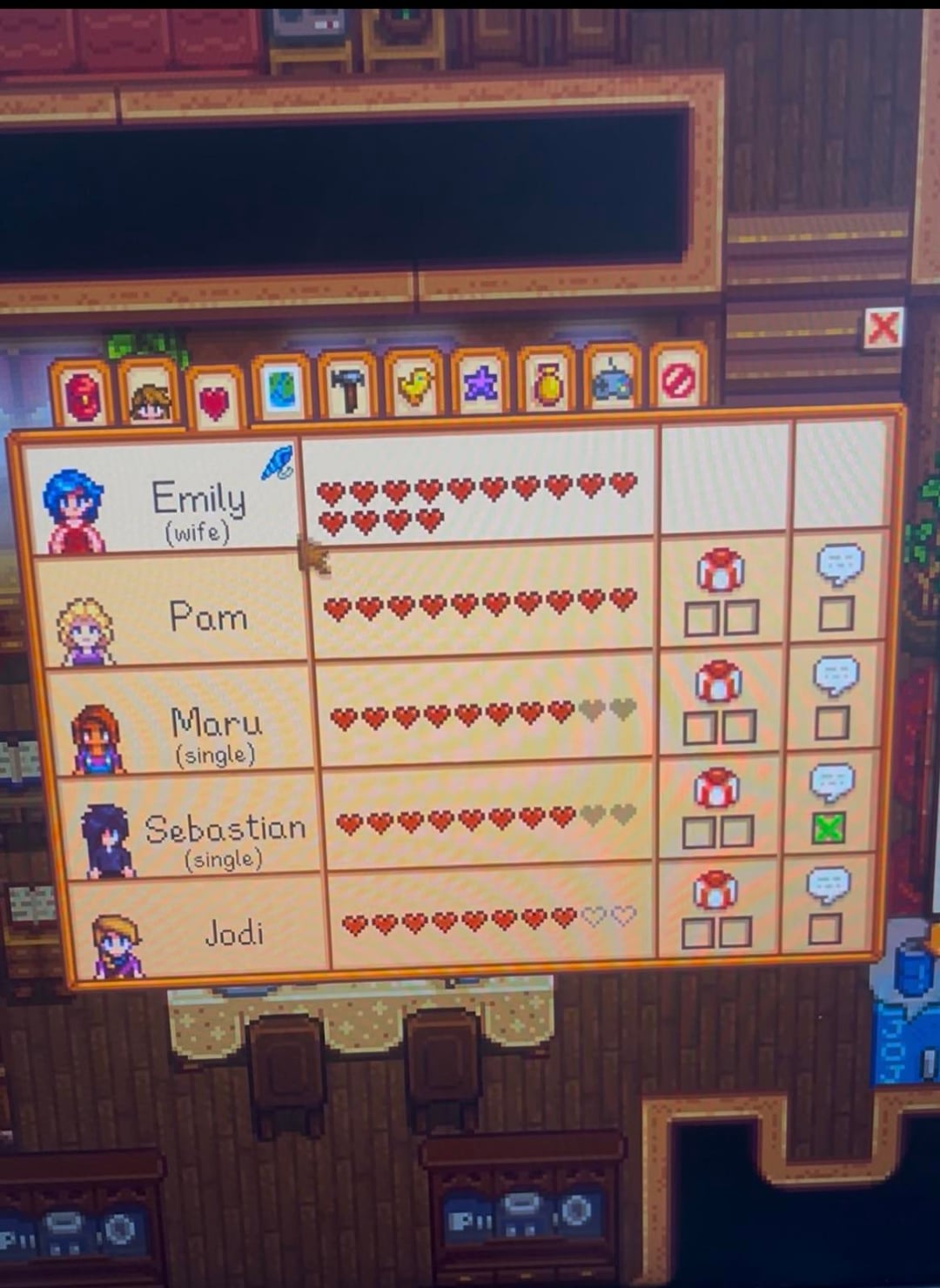 Tldr: i modified the savefiles by hand to change my spouse from Emily to sebastian but did not modify it the maximum hearts,(it wasnt correctly modified, it still showed sebastian as single even tho he was in my house and Emily as (wife) but she wasn’t in the house?)