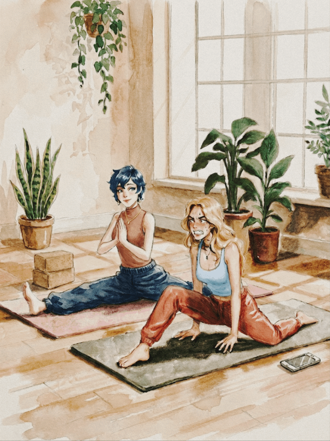 and probably no one will make the connection, but with these accessories next to the girls, I was mainly going for contrasts – next to Haley is a phone, and yoga is clearly not her thing, but in contrast there’s Emiy with her yoga blocks, symbolising calm, and the fact that she’ll want to do the oversplits in a moment whilst Haley can’t even do the basic one because again – it’s not her world