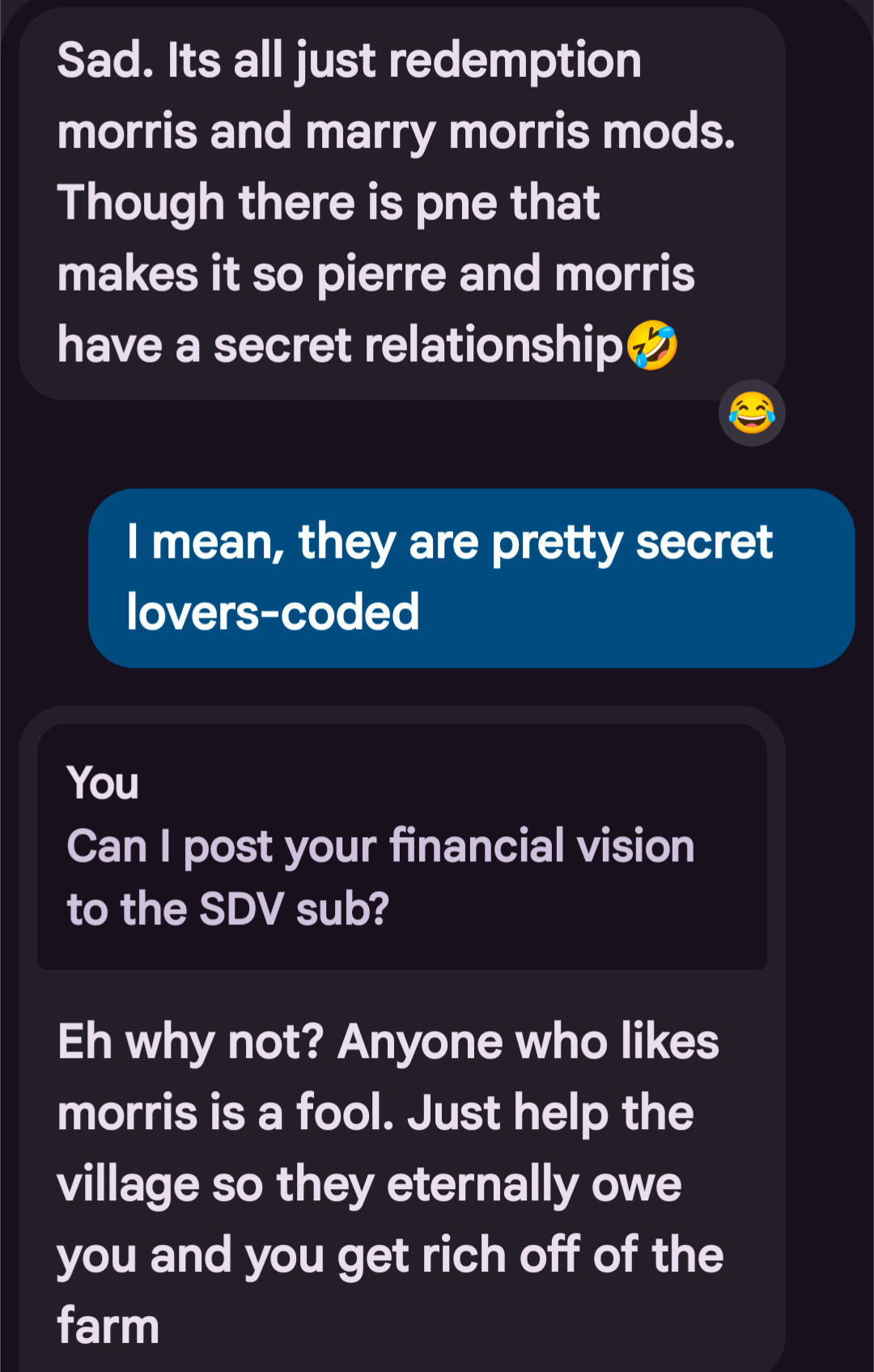 Based. Everytime I finish the community center I let them fight it out, just so I can See Morris get punched through the roof!