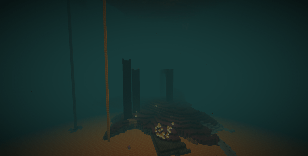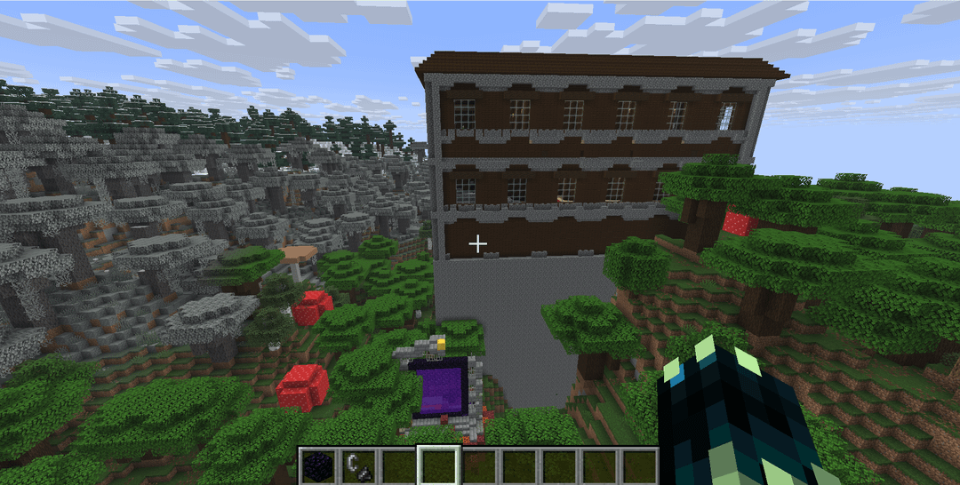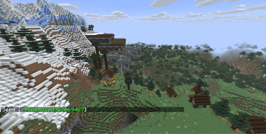 A Woodland Mansion Partially Hidden in a Mountain With 6 Biomes Around it Including a Very Small Taiga Which has Somehow Managed to Generate a Village at Spawn + Another Mansion 420 Blocks Away with a Ruined Portal that Spawns you Right Next to big Lava Lake with a Nether Fortress on the Other Side