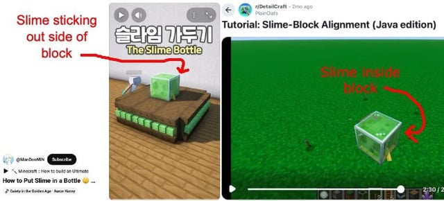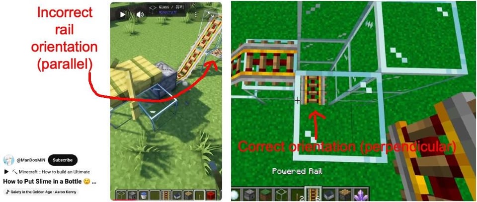 Hilariously, the immediate thing I noticed is that it was copied incorrectly; ManDooMiN used the wrong rail orientation in the building step which leads to the slime sticking out the side of the block. Kind of surprising given they literally had a step by step guide but whatever