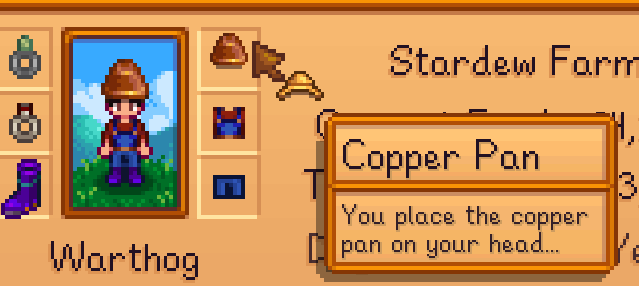 Occidentally20 on April 4, 2026 8:19 am Users on PC and mobile can use [this mod](https://www.nexusmods.com/stardewvalley/mods/26741) to put the pan on their head and then a hat on top of that, for an efficiency/fashion combo.