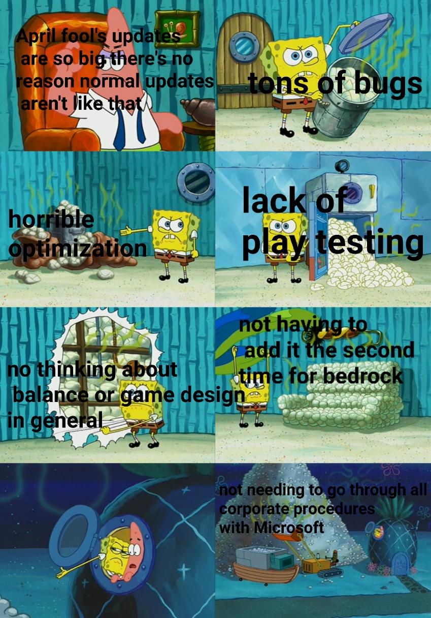 April fool’s updates have so much stuff because of the “random bullshit go” mentality by Charming_Agent_9034 Memes Minecraft Minecraft Memes