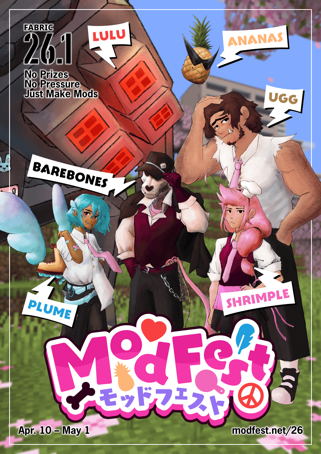 You can sign up to create and submit an original mod compatible with **fabric 26.1** – optionally fitting some or all of the theme “Animation, Affection, Academia!”. After submitting a mod, you’ll also create an in-game build to demo your submission to other modders and players. Signups are handled through [our discord](https://discord.gg/hJCAxKBrcA?event=1490133974633283784), with instructions in the events channel.
