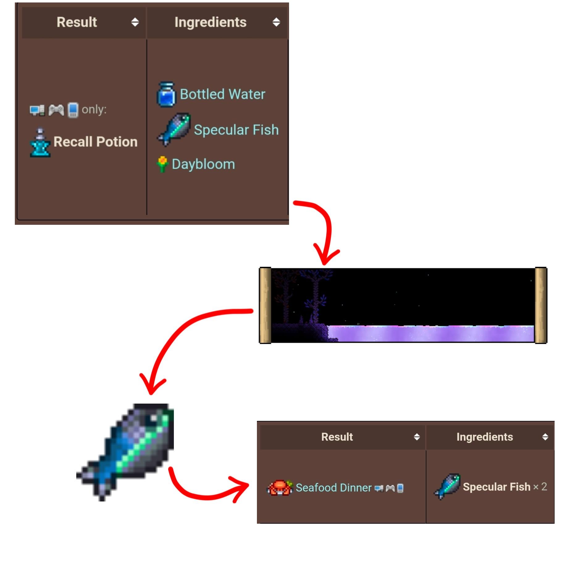 You can shimmer the recall potions you get all over the world into specular fishes, which you can then cook into seafood dinner which gives you 14 minutes of plenty satisfied by just-a-simple-guy Terraria