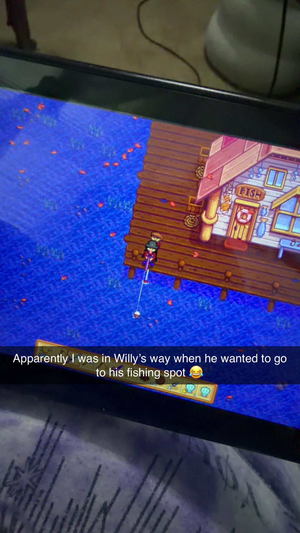 I forgot that Willy stands here to fish. He was like “…” 🤷♀️ and started fishing anyway 😂😂 by Ordinary_giraffe90 Stardew Valley