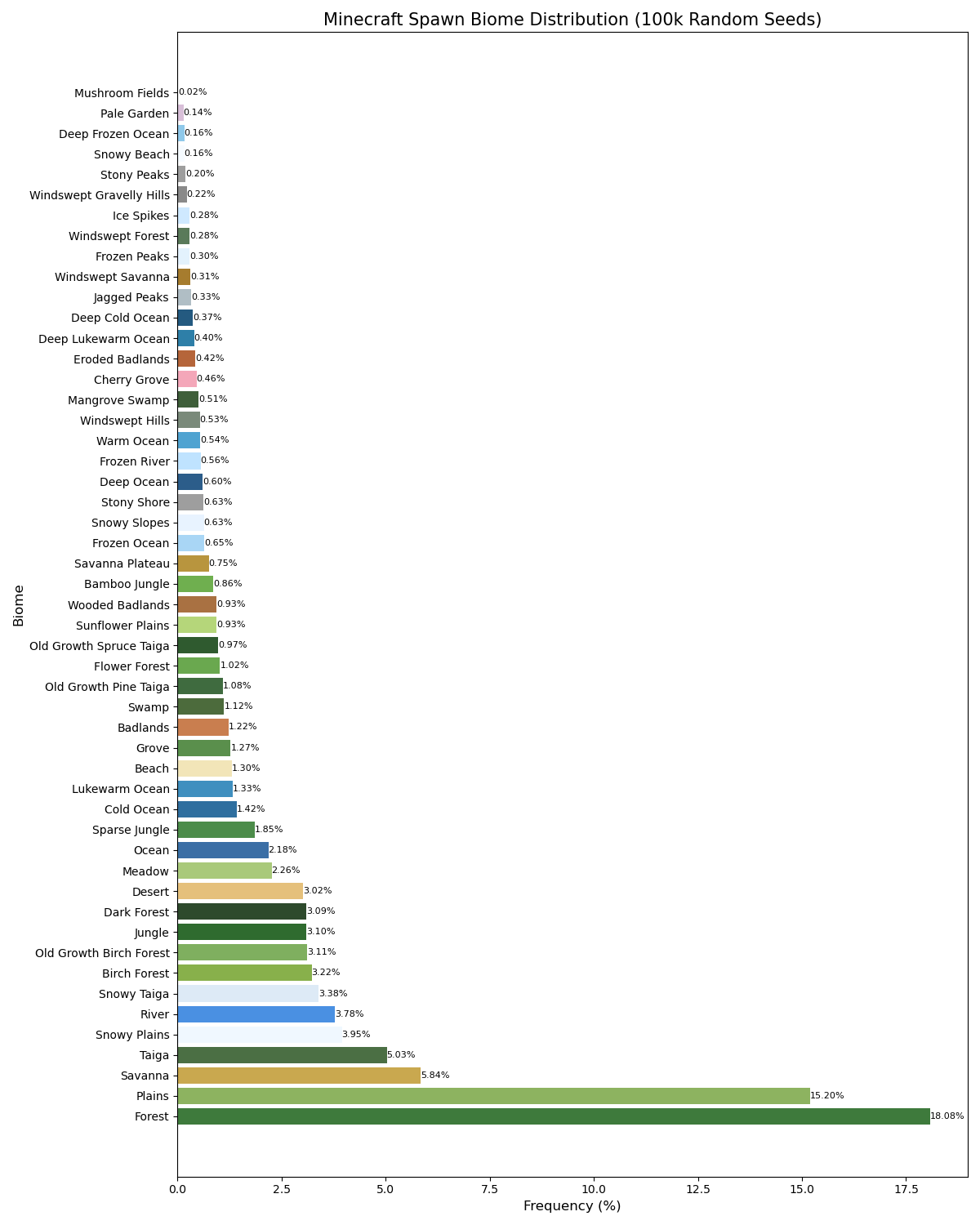 I really wish this was weighted by expected frequency based on the distributions of each biome across entire maps. Like forest and plains are expected to be high on the list because they’re also the most frequent. What people really care about is what kinds of *bias* there might be for or against certain biomes. Like if mushroom islands take up (for example) 1% of the land in most worlds, it is totally uninteresting to learn that 1% of spawns are on mushroom islands. What would be interesting is learning that world spawns are significantly higher or lower than what would be expected, like if mushroom island spawns only occurred 0.1% of the time (in my example).