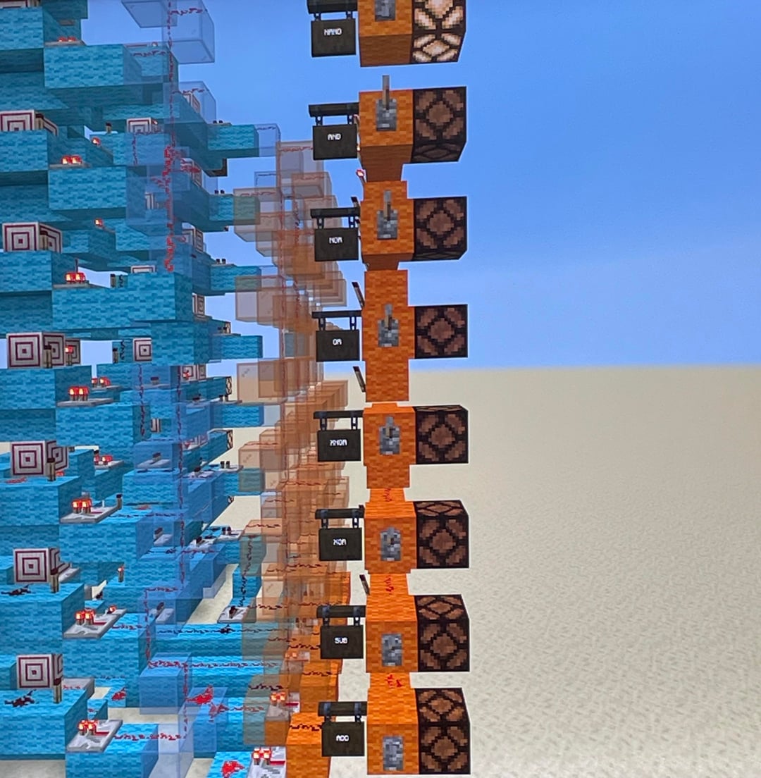In the pictures it is doing 11010101 NAND 10001011 and getting 01111110 which is correct it can also do addition, subtraction, XOR, XNOR, OR, NOR, AND and NAND. I used mattbatwings’s youtube video on it to learn how to do it. by Slow-Television-5303 Minecraft Minecraft Redstone Redstone