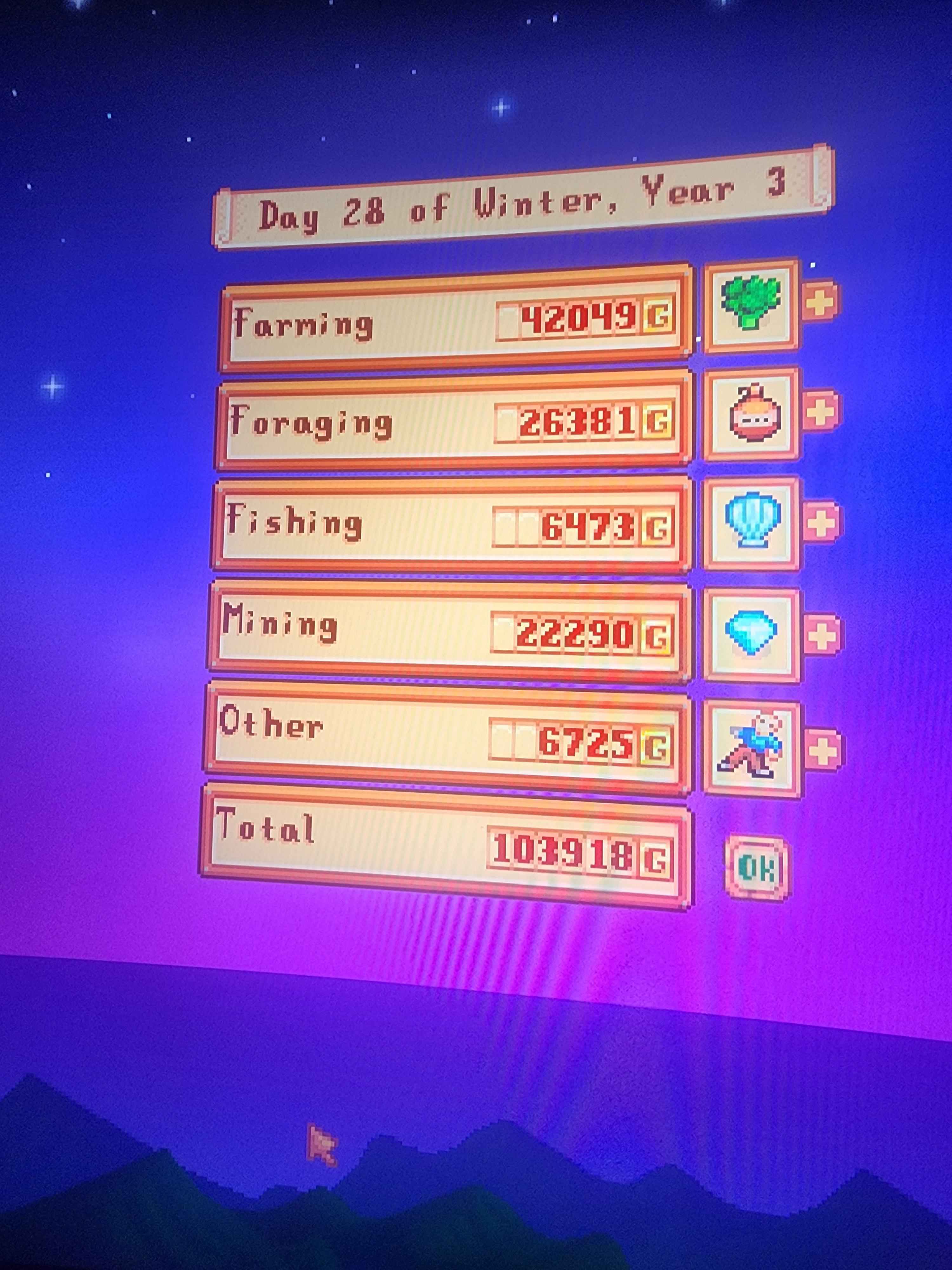 Wow!! I remember hitting my first 100k. Honestly was the best feeling! Iโm in year 5 now and I make about a million per season atm. I have an ancient fruit farm with 135 kegs which makes me about 130k every week, atm iโve stockpiled starfruit and hops for the kegs from summer and I have another 135 kegs (iโve organised them in a certain way so thatโs how many I can fit in one shed lol) – 135 starfruit wine gives me about 303k a week. Pale ale gives me about 31,500 every 2 ish days. Bear in mind at the moment I donโt constantly brew starfruit or hops it just depends on what season we are in and how many i still have. Usually takes about 2 seasons including the one I grew those in to get rid of all my stock. But iโm about to finish fall and I still have 800 hops left๐คฆ๐ผโโ๏ธBut anyways I also have a mystic syrup farm, plus 41 crystalariums for diamonds which produces every 5 days. Plus a fairy rose honey farm on ginger island. Theres a LOT more improvement for me to get more money but yeah id say the most iโve made in one season is about a million and a bit maybe? Winter sucks but I always have spare crops plus the ancient fruit grows in the greenhouse so thats all year round anyways which helps so all of that gets me through winter at least. And aside from all of those my normal crops get me 100k-300k every so often depending on which ones I have at the time. I have a stupid amount of growing areas on my farm so I have about 1008 spaces for different crops to plant.