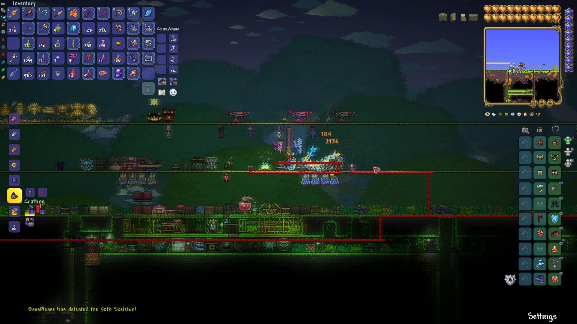 Arena included Bast Statue, Campfire, Heart Lantern, Dryad, Gnome, and honey blocks, as well as a 1-second timer attached to 4 heart statues and a skeleton statue for i-frames (I was originally going to get a Ham Bat and attack skeletons with it for even more regen but decided on Shiny Stone instead).
