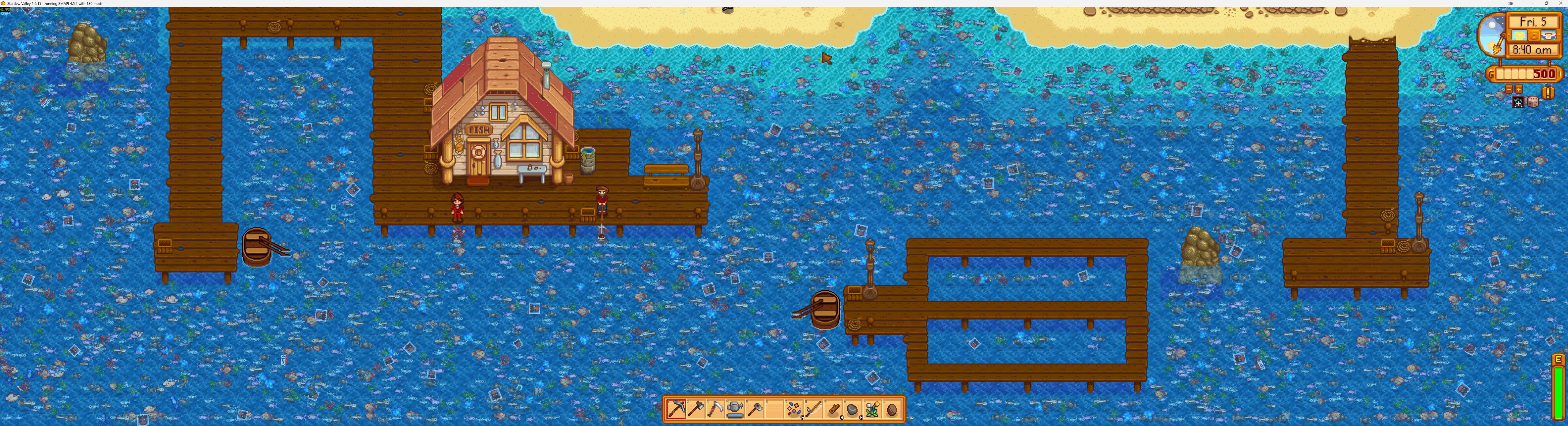 – Beach Extension for Crab Pots – This just adds that rowboat and the structure between the piers. No fish, but it is on the screenshot, so…