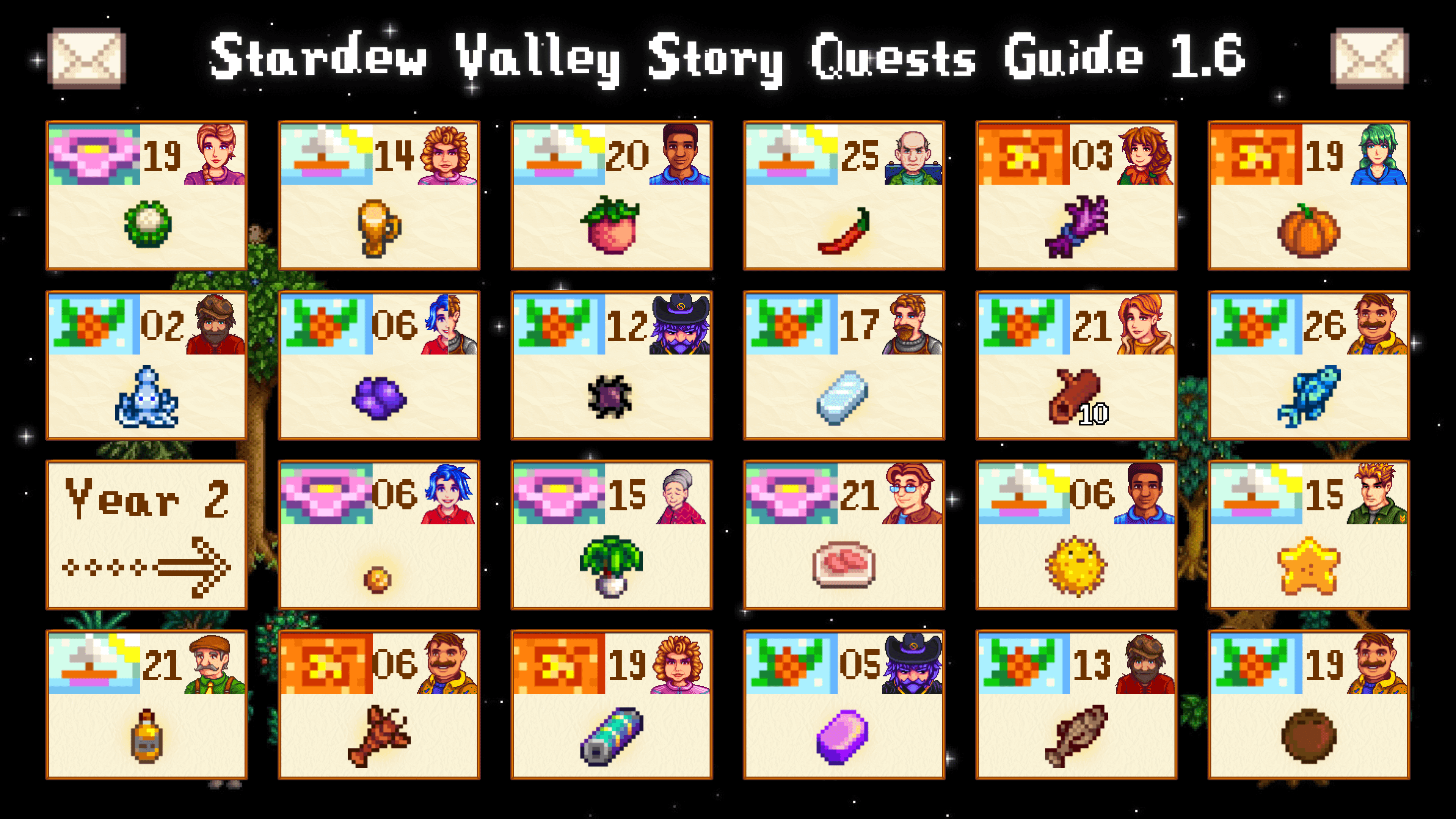I made a visual story quests guide for Stardew Valley 1.6 that shows you all the items NPCs are going to request by mail