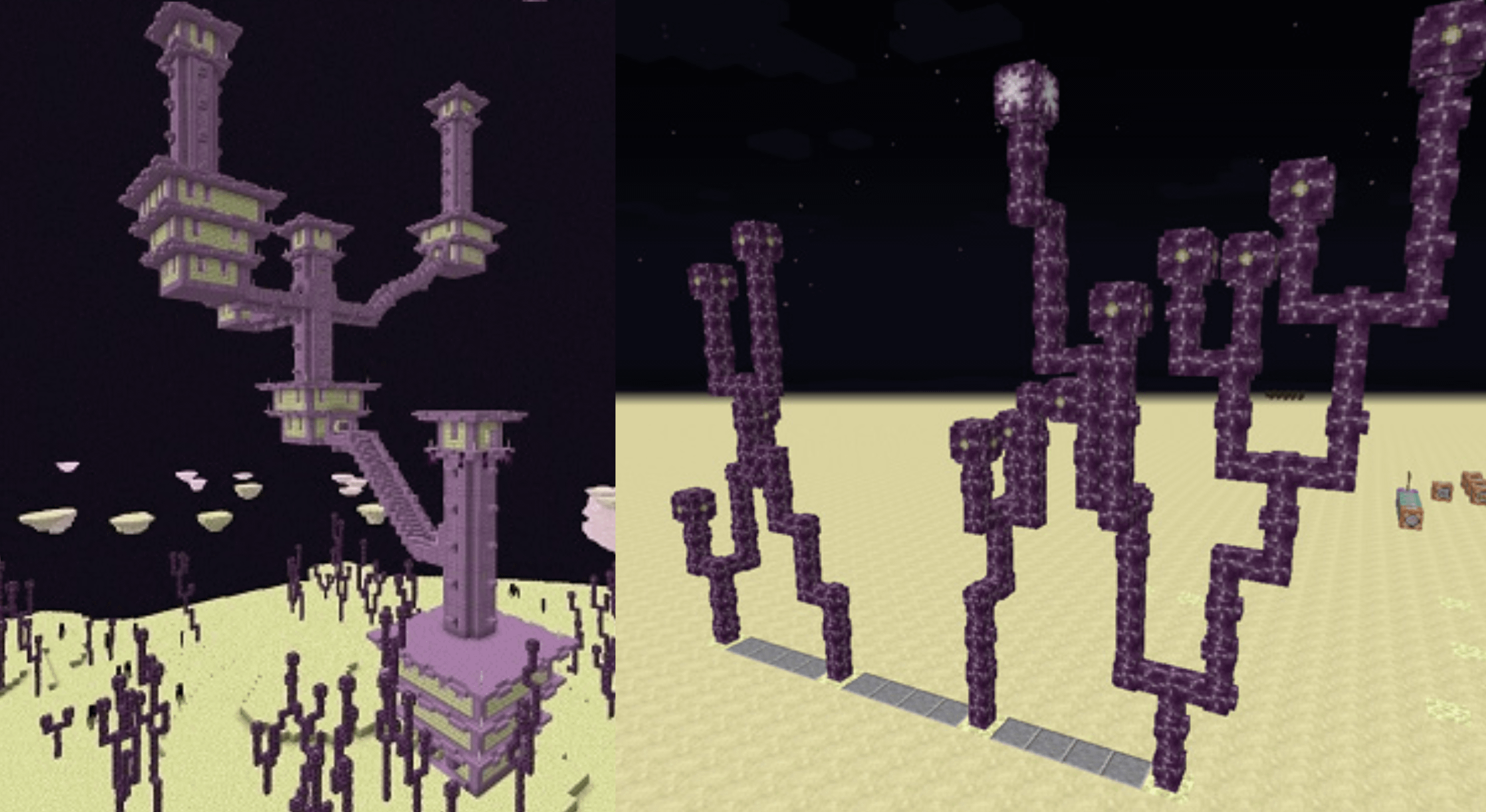 Meanwhile the end is space themed, so there are floating structures like the boat and extremely top heavy structures that are tethered to the ground but don’t need to bear their own weight. The structure with a root and branching limbs is ideal for the end environment, so thats what they use.