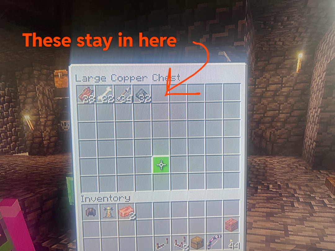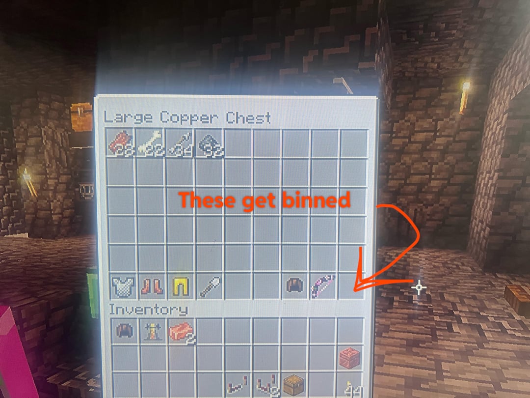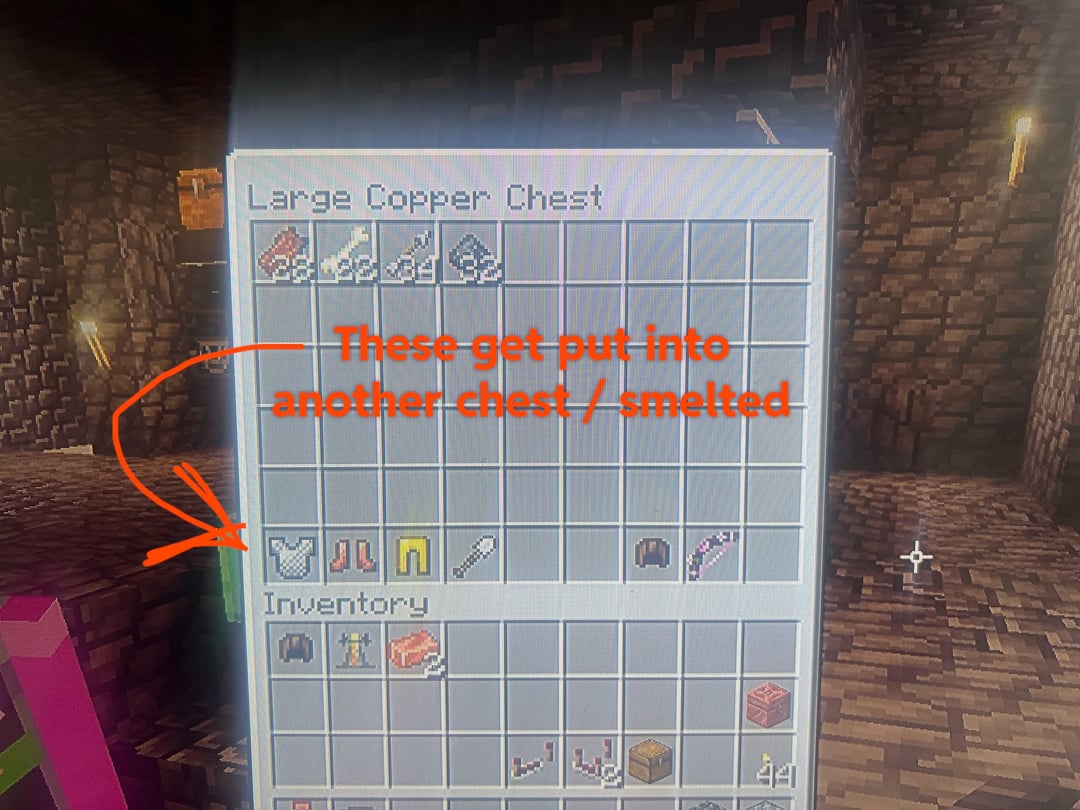 I’ve build a mob grinder and everything gets filtered into a copper chest, where my copper golem will then take the stackable items that go in (flesh, bones, arrows, gunpowder, etc…) and place them in their individual organised chests.