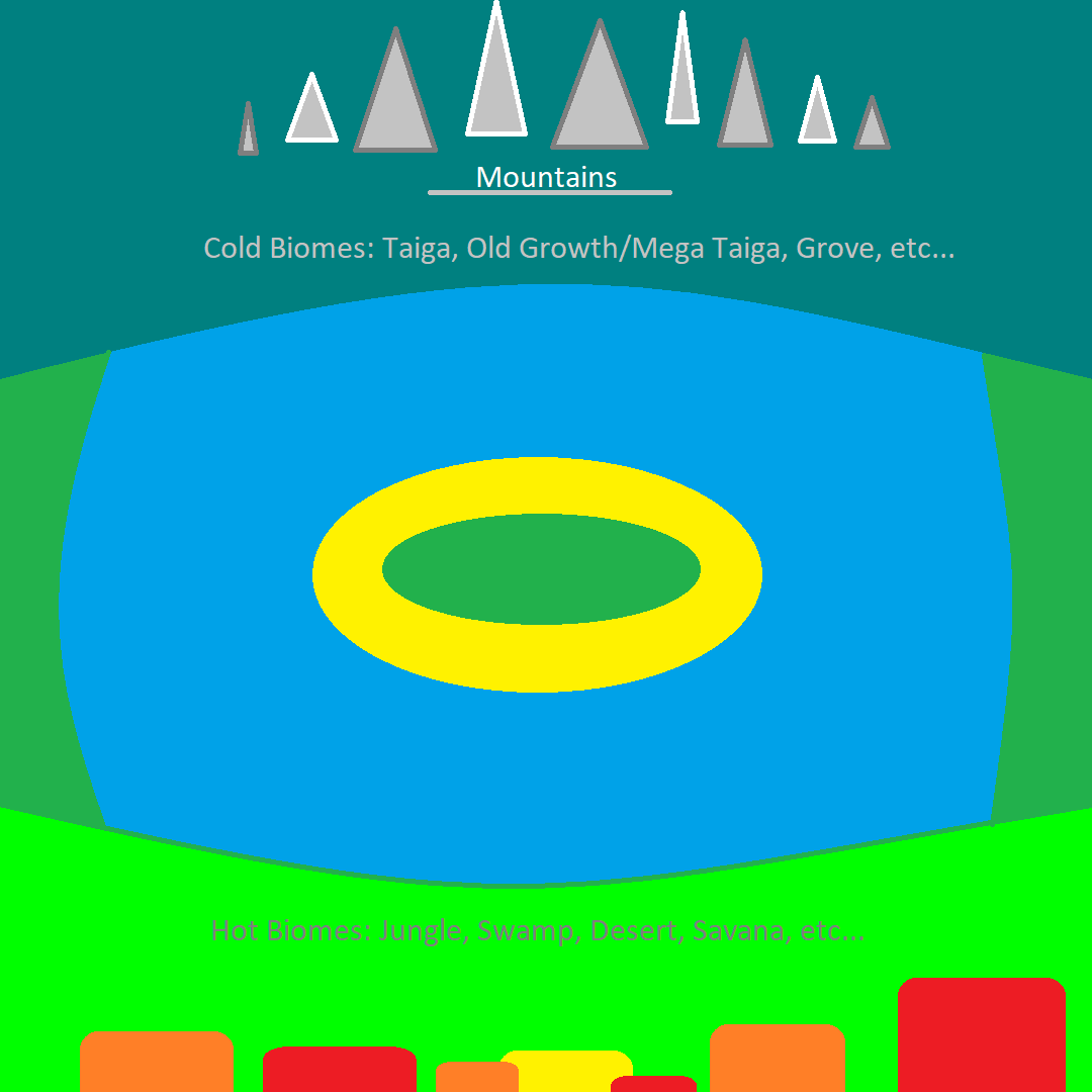The Island and the biomes between the Hot and Cold biomes can be Plains, Flower Forests, Birch Forests, Oak Forests, etc…