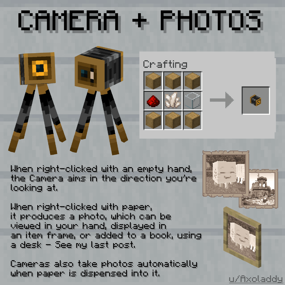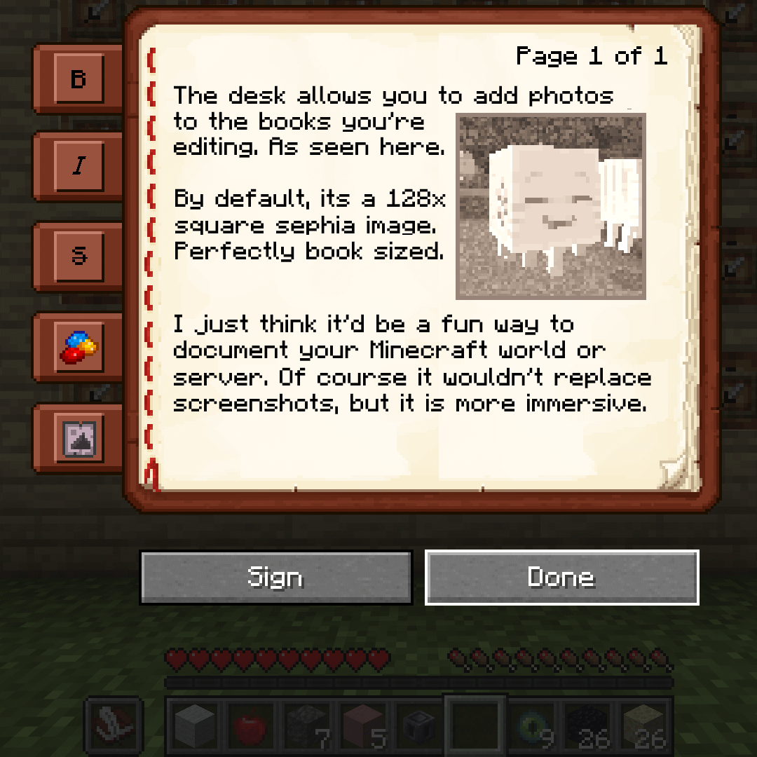 If you're not familiar with why my book and quill look like this, the Camera works in tandem with the Writing Desk, a block I suggested a few days ago, that gives you more options when editing books. One of those ideas was the option to resize the book, giving you more space to add photos.