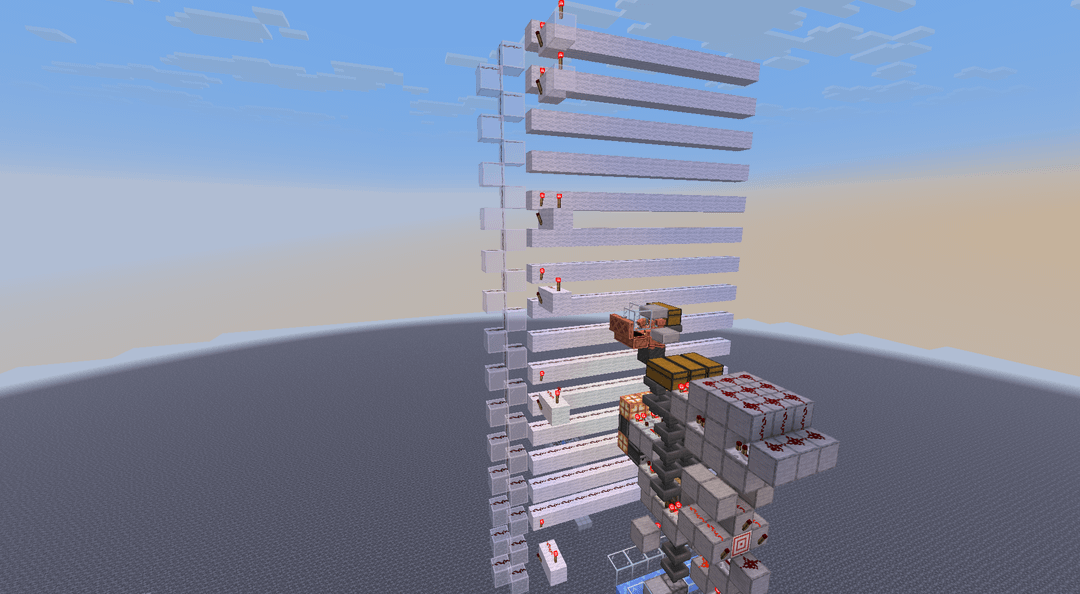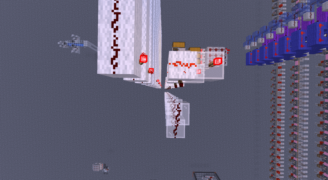 What hes specifically needing help with is a vertical AND gate to connect the torches on the sides of the white wool. hes tried making a series of AND gates next to them and conecting them together, hence the white glass redstone tower. he need to be able to get any number of AND gates to vertically connect and output a single signal when a true AND between each output is reached. Feel free to paraphrase.
