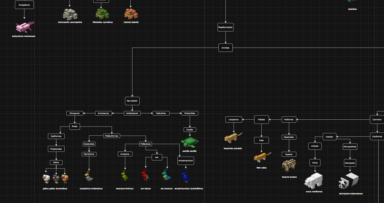Okay, this took a whole weekend, but here it is. I've used taxonomic criteria to classify all the living things in Minecraft into their corresponding taxa. No plant, fungus, or animal has been left out (those that couldn't be included in the classification have their reasons). The thing is, the image is so big that I need to put a link to it, so enjoy! And here's a little preview of what's inside. Click here!