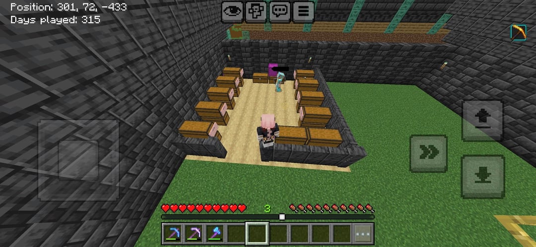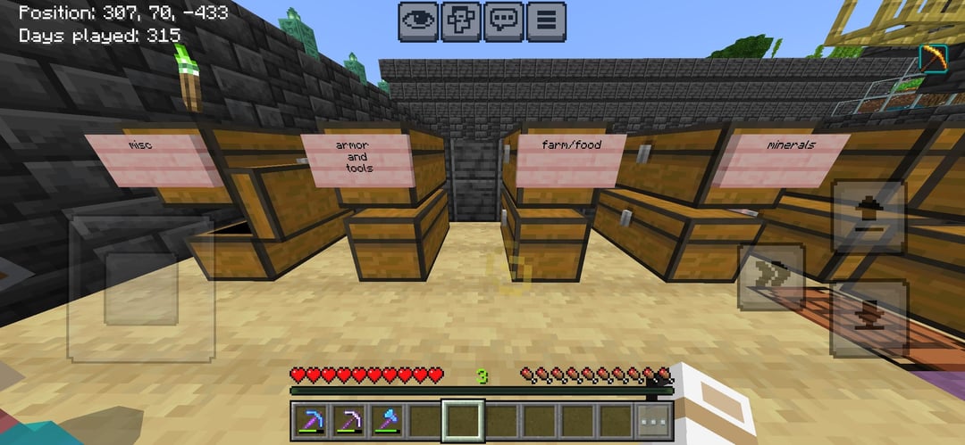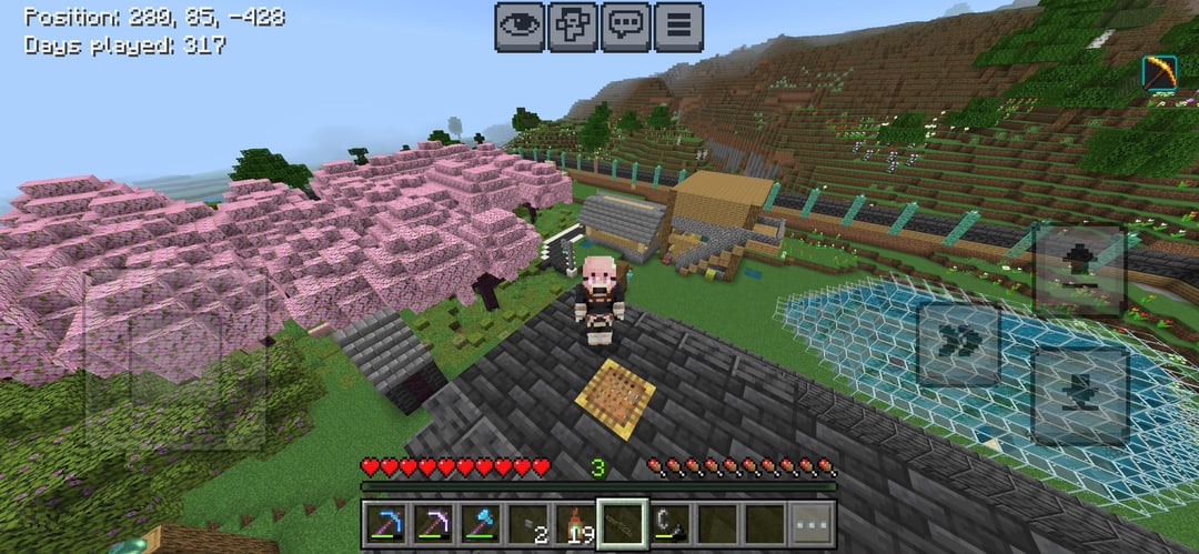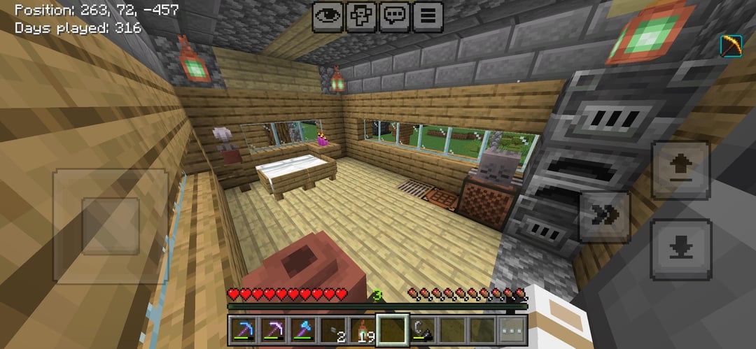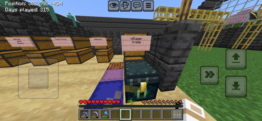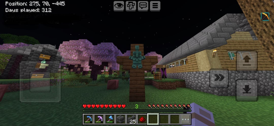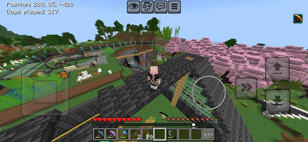 We get on when he has the time and it’s always really fun, today I made a storage room in this building I’m making I ran out of deepslate so the roof is still unfinished. but we have the beacon almost max level and it’s in the roof (I joined the world at about day 150 but still) and sorry I don’t have pics of the bee farm in the 6th photo or the bamboo and sugar Cain factory