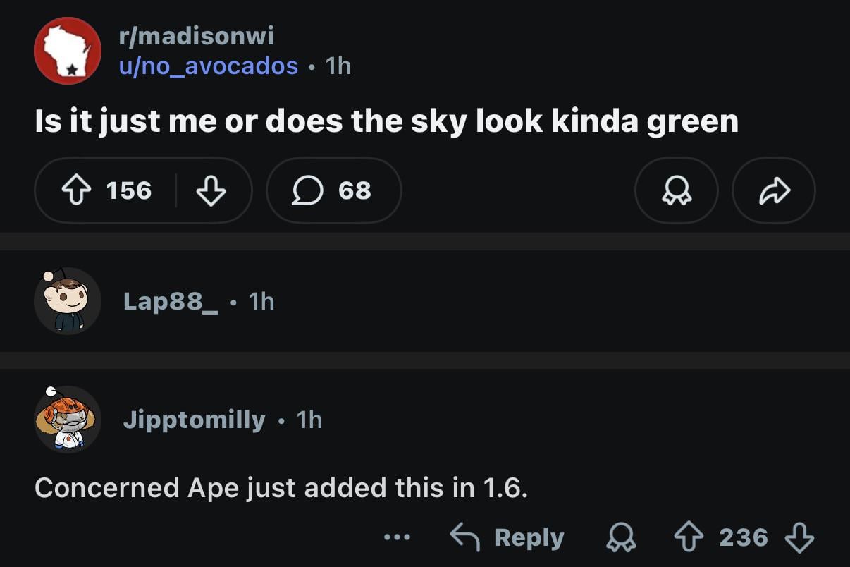DazzlingDoofus71 on April 15, 2026 2:29 am I’m from tornado alley… green skies mean hide somewhere you can’t see the sky! Y’all be safe 🙏🏼