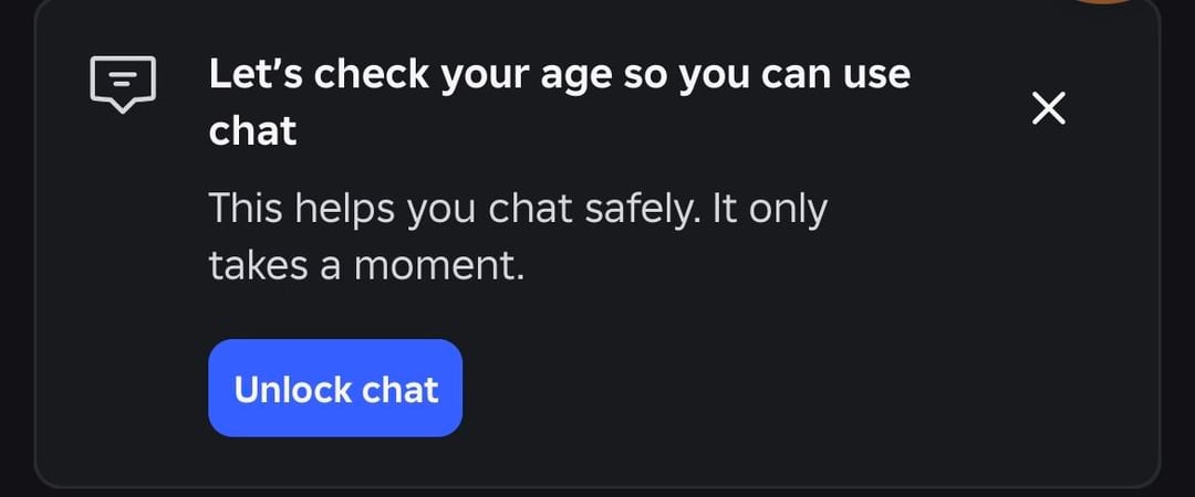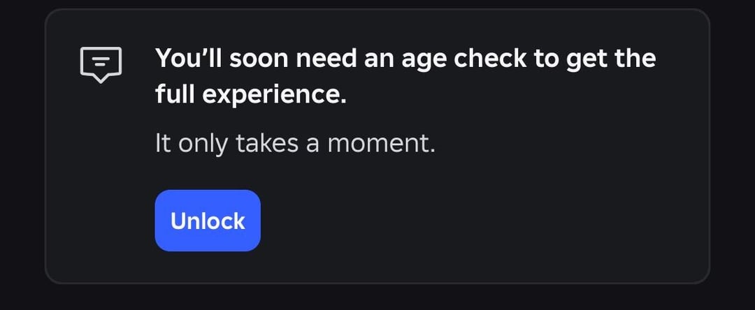 The message on the home screen now says to do an age check to “unlock the full experince”. What does that mean? Does that mean that they will restrict more features than the chat?
