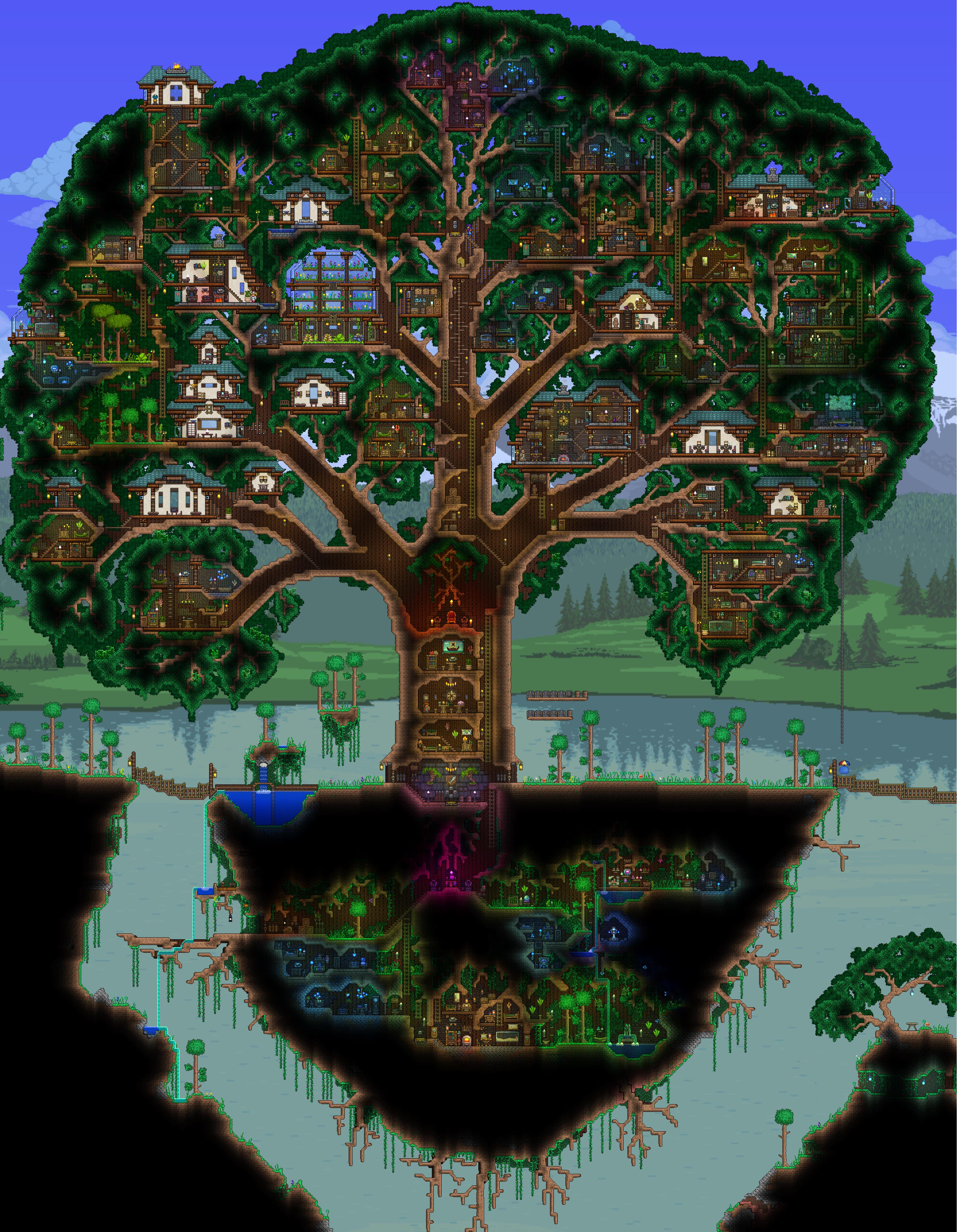 Hi, so I’m new to the game, just started a few days ago, and right now I have a giant tower with all of my NPCs in there, BUT I just learned that certain NPCs require certain biomes to work at their fullest. So my idea is to build a giant tree just like this image, but with different biomes inside this giant tree, and my question is: