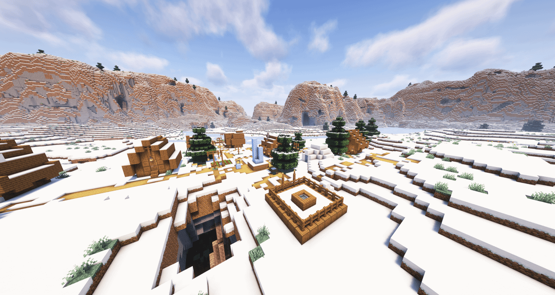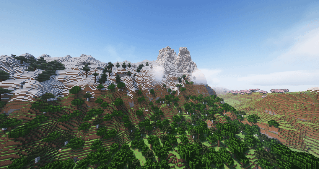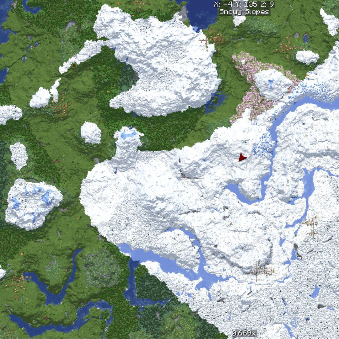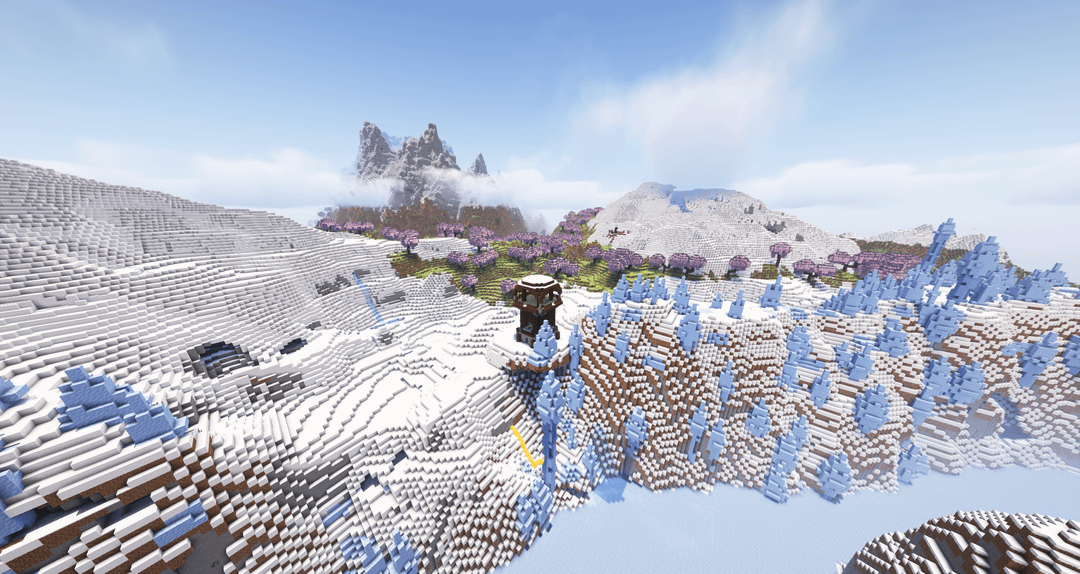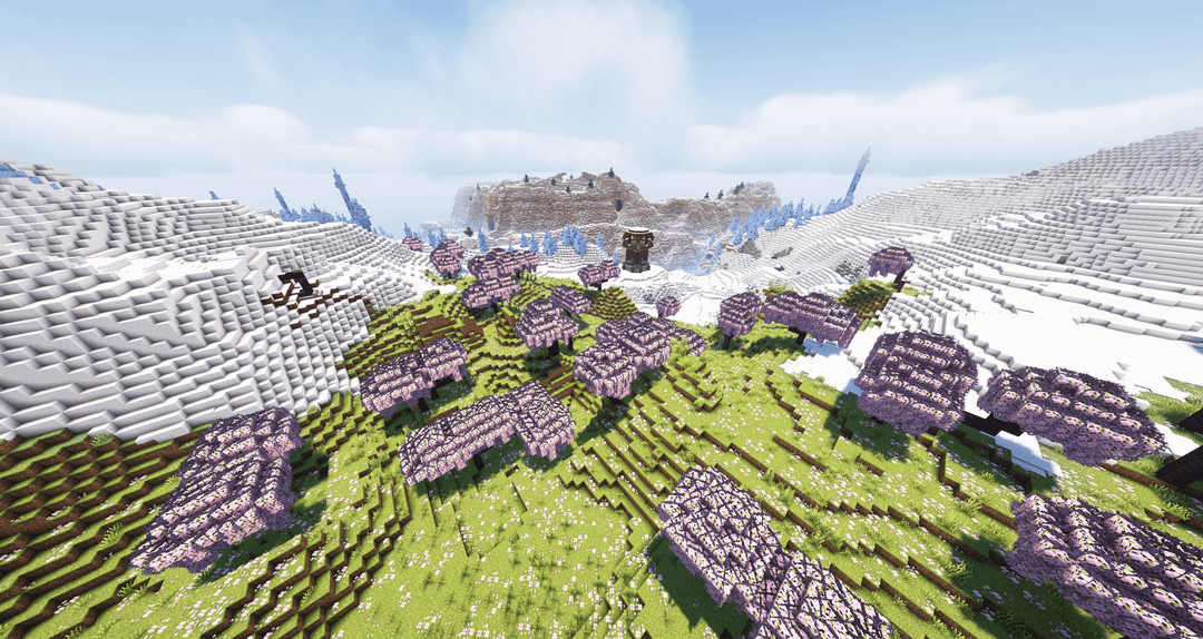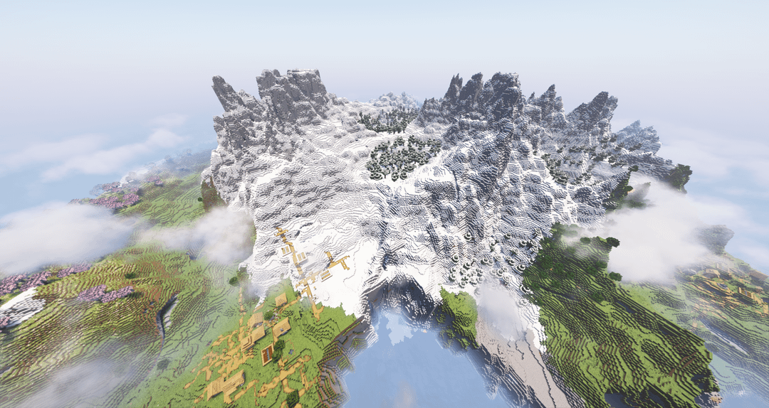I randomly found this seed while playing in hardcore mode. You spawn on a mountain peak with an insane view! If you go north there is a ruined portal and a pillager outpost near a cherry blossom and an ice spike biome! In the zoomed in map you can see a total of 16 villages, one of them even have an igloo in it. Overall the terrain generation is what really drew my eyes, hope you enjoy the screenshots c: