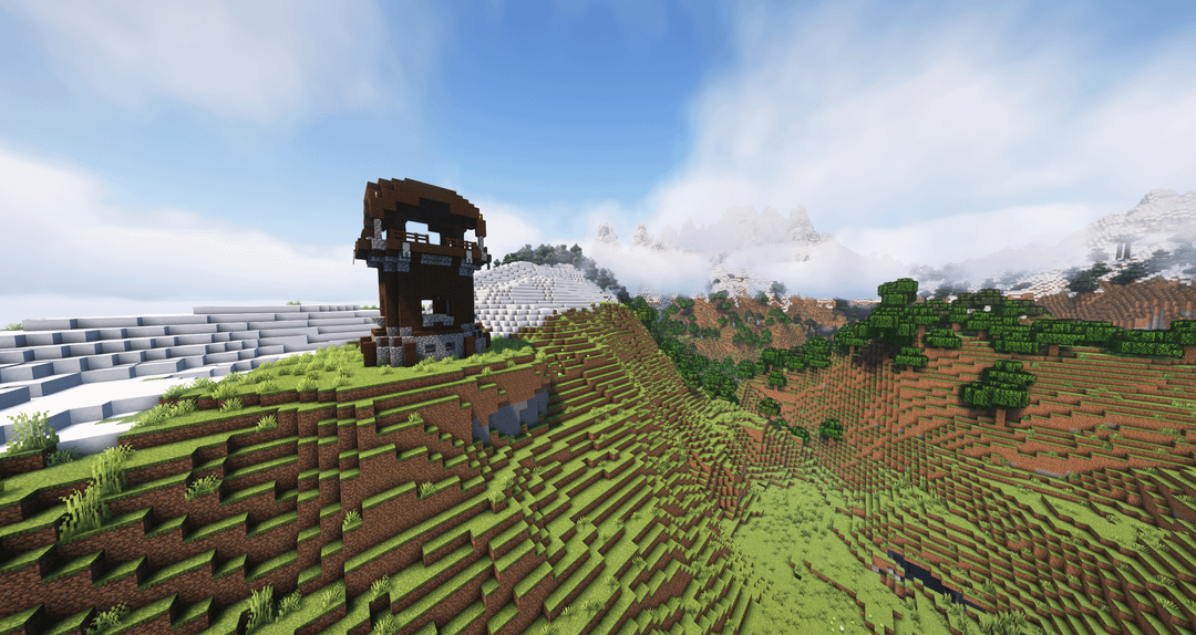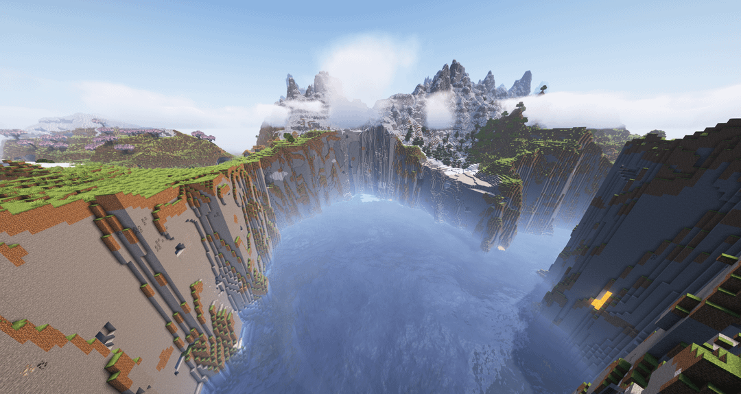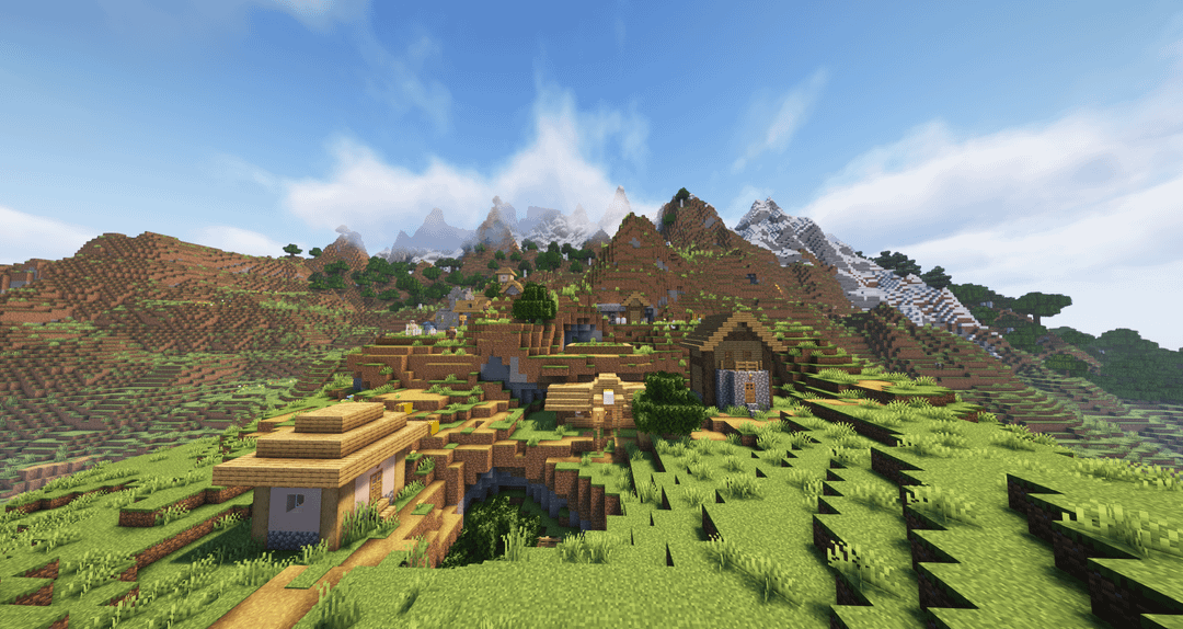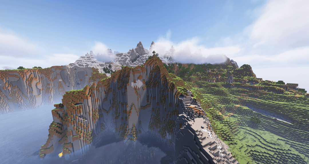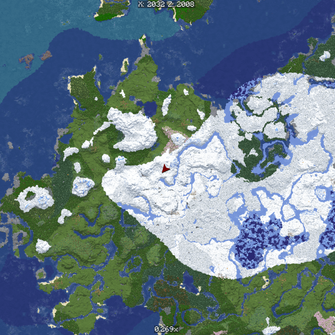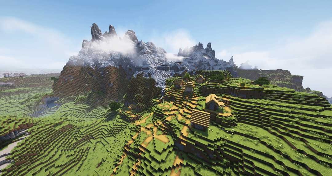 I randomly found this seed while playing in hardcore mode. You spawn on a mountain peak with an insane view! If you go north there is a ruined portal and a pillager outpost near a cherry blossom and an ice spike biome! In the zoomed in map you can see a total of 16 villages, one of them even have an igloo in it. Overall the terrain generation is what really drew my eyes, hope you enjoy the screenshots c:
