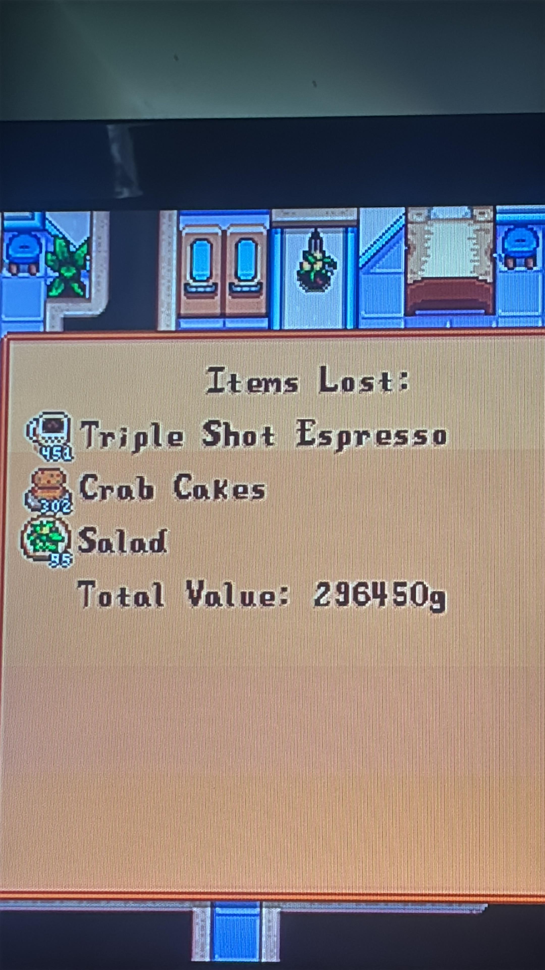 I’m not very good at any video game, skull caverns kicks my backside every which way. I went to skull caverns, I was doing fine I found some holes to jump down I was kicking butt, then I got the mist, serpents left and right, I was doing ok, I was surviving (just about) but I wasn’t paying particular attention to my health, the mist was over the last serpent bit my behind and I died. I was fine with that, I even said to myself Okie dokie I wonder what I lost Harvey did he’s whole “easy” speech and THIS came on my screen!! When I say I was mad I mean it, and I forgot I could only recover 1 item and I clicked the espresso 🥲 the thing that I have an abundance of in the chests back at my farm not the crab cakes that are way harder to sort out 🤦♀️🤦♀️ but yeah I definitely restarted the day again.