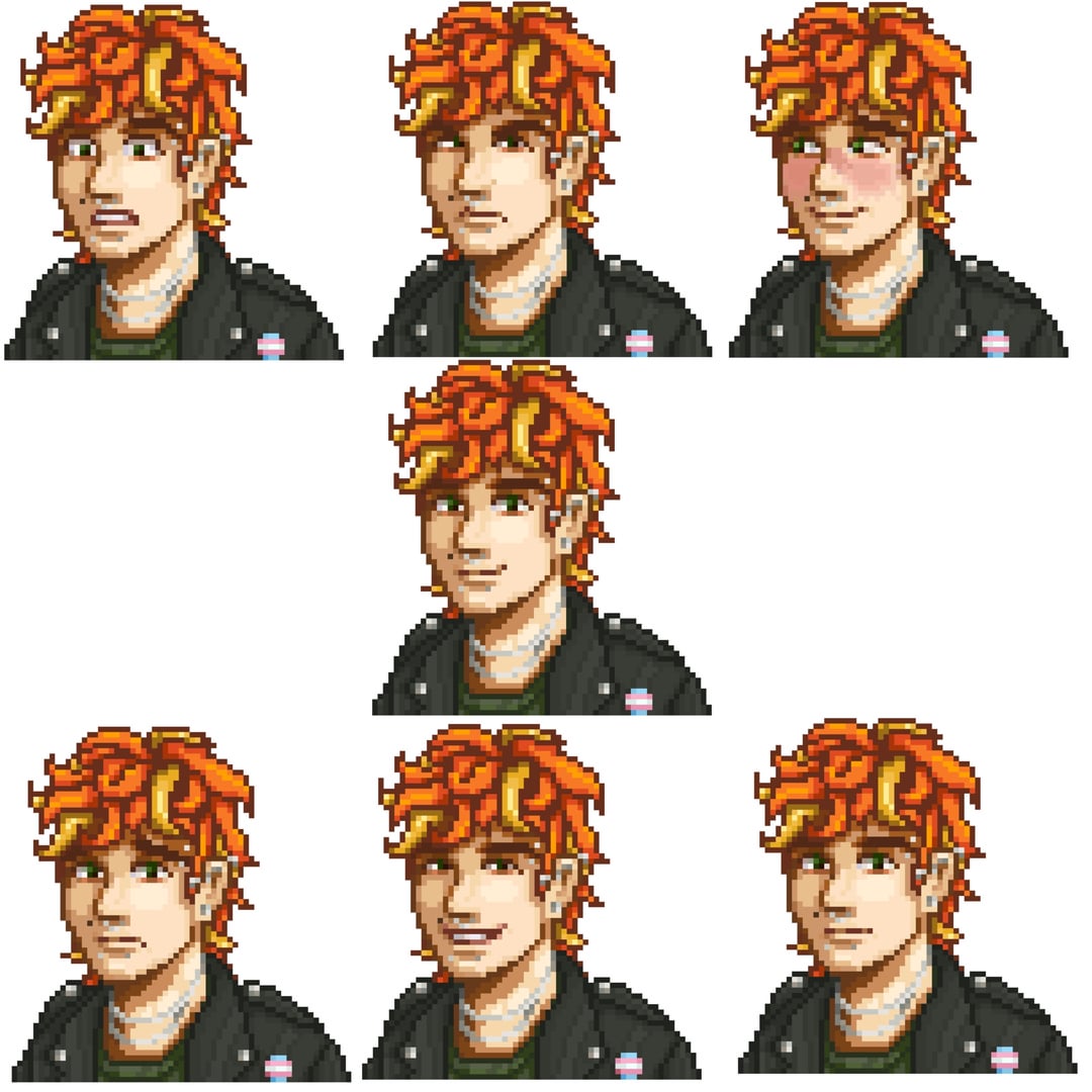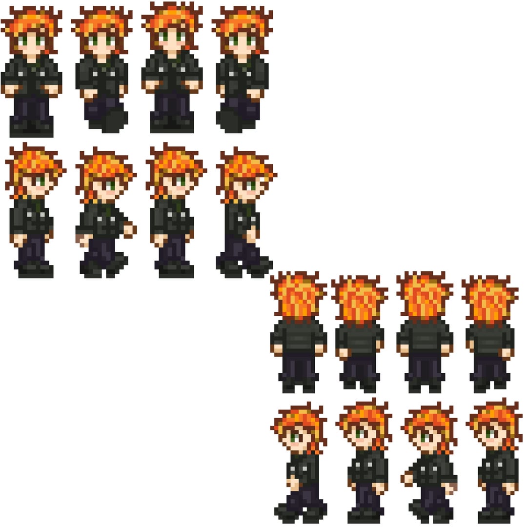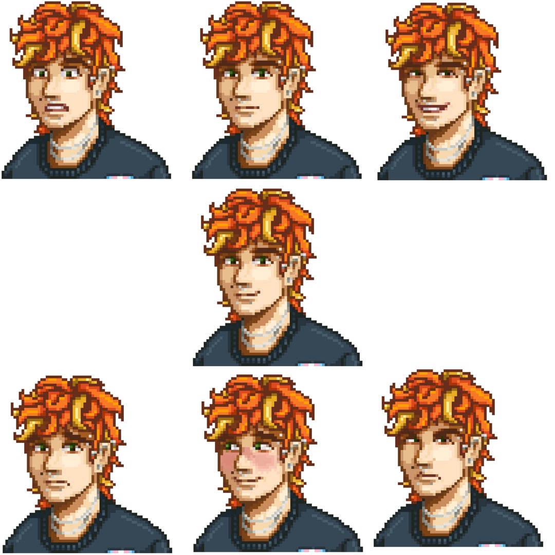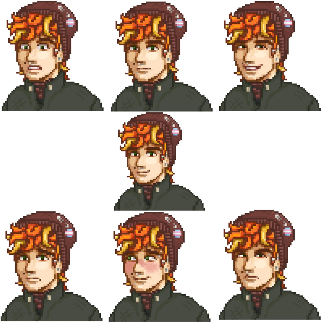 Just wanted to do one sprite but hit flow state and just straight up did a Summer/Fall outfit, a Winter outfit, a Summer outfit, a Beach outfit, all expressions in each outfit and mini sprites for idling and walking in each outfit. Still have to do emotes and unique cutscenes of his in each outfit lol! But I think what I have so far us still cool and a lot! Js decided to share it lol
