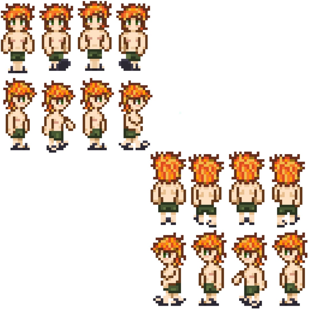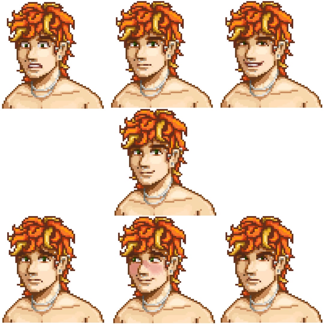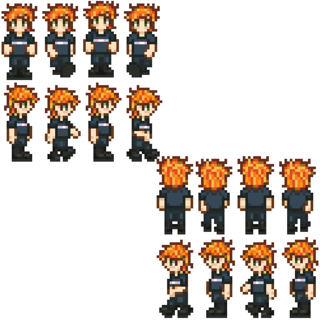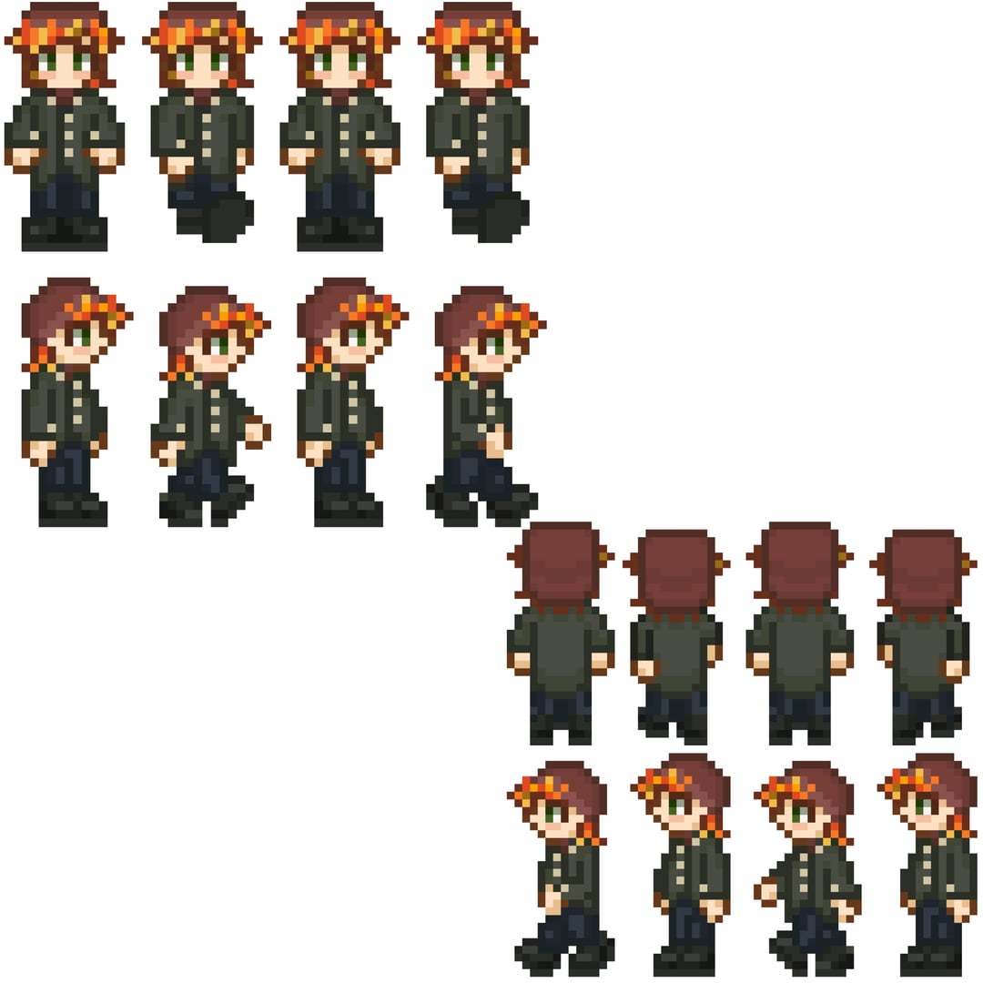 Just wanted to do one sprite but hit flow state and just straight up did a Summer/Fall outfit, a Winter outfit, a Summer outfit, a Beach outfit, all expressions in each outfit and mini sprites for idling and walking in each outfit. Still have to do emotes and unique cutscenes of his in each outfit lol! But I think what I have so far us still cool and a lot! Js decided to share it lol