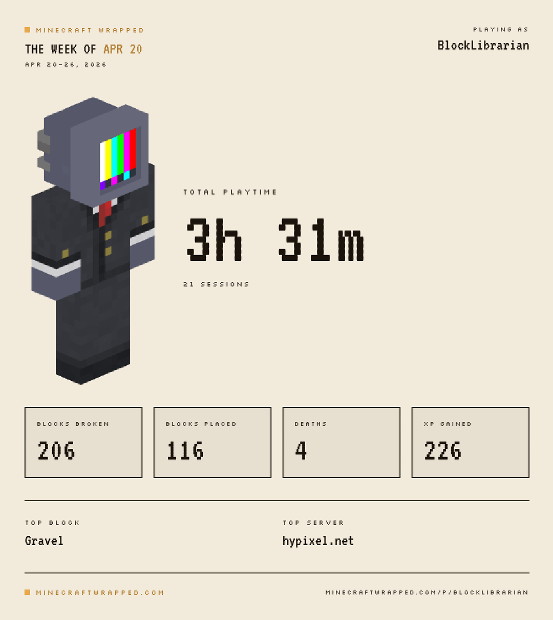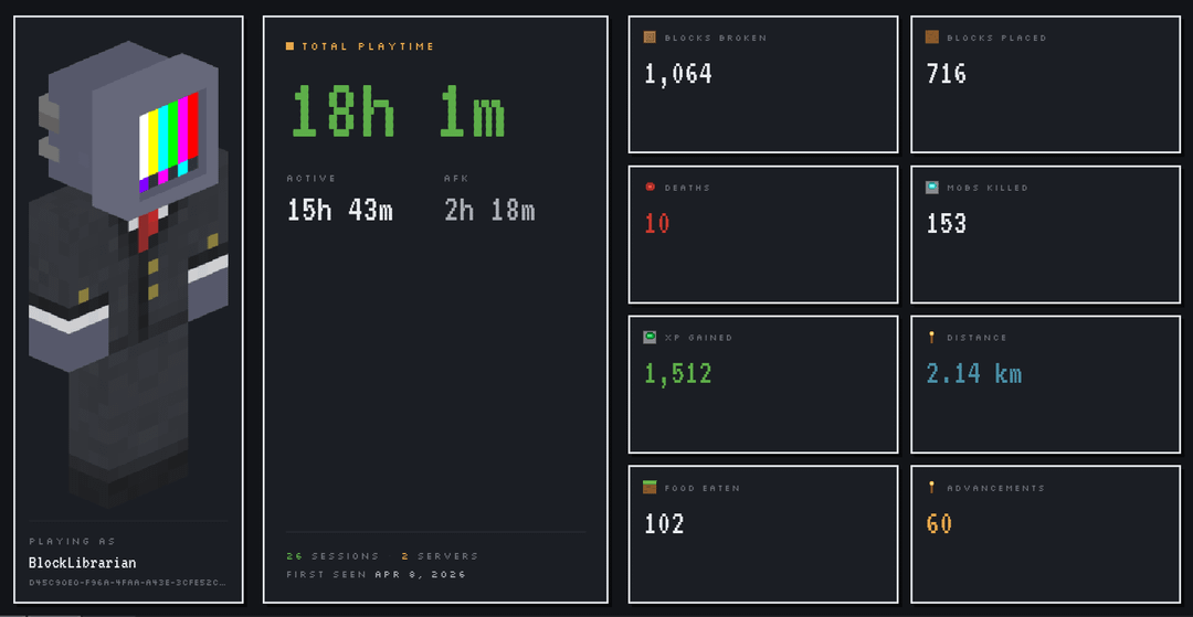 On install it reads every world's stats.json and adds up what you've already played across all of them. From there it keeps tracking live – sessions, blocks, deaths, mobs, biomes, the usual – across every world and server going forward. Feeds a web dashboard with the full breakdown (top broken blocks, "how you died," heatmap of when you play) and a Wrapped card that auto-generates every Sunday, Spotify-style.