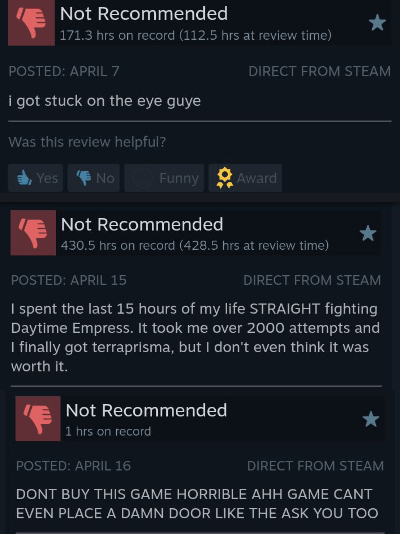 DSonla on April 24, 2026 10:29 am Negative review because the game is too hard for you ? Babies. Know your limit. Like I know I don’t have enough skills to beat the empress of light during daytime in classic mode.