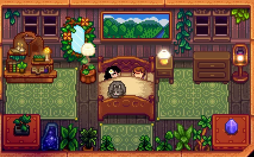 Idk what it says about the state of my real life that sometimes when I end the night in stardew I don’t go to sleep right away because I imagine being in my cozy nice house all tired out from making my farm work and looking around at all the nice stuff I’ve used to make the place homey and the cat curled up between me and a husband whos never been trouble and I want to sit and indulge in it and this gave me that exact feeling. I love this. This screenshot is what this game is, to me. Like sure you go harvest a shed of kegs and make millions but this is it.